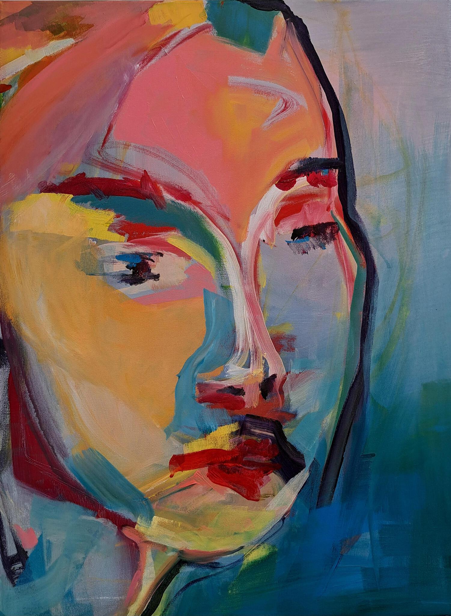 Expressief en intuitief geschilderd kleurrijk portret. Acryl op doek.