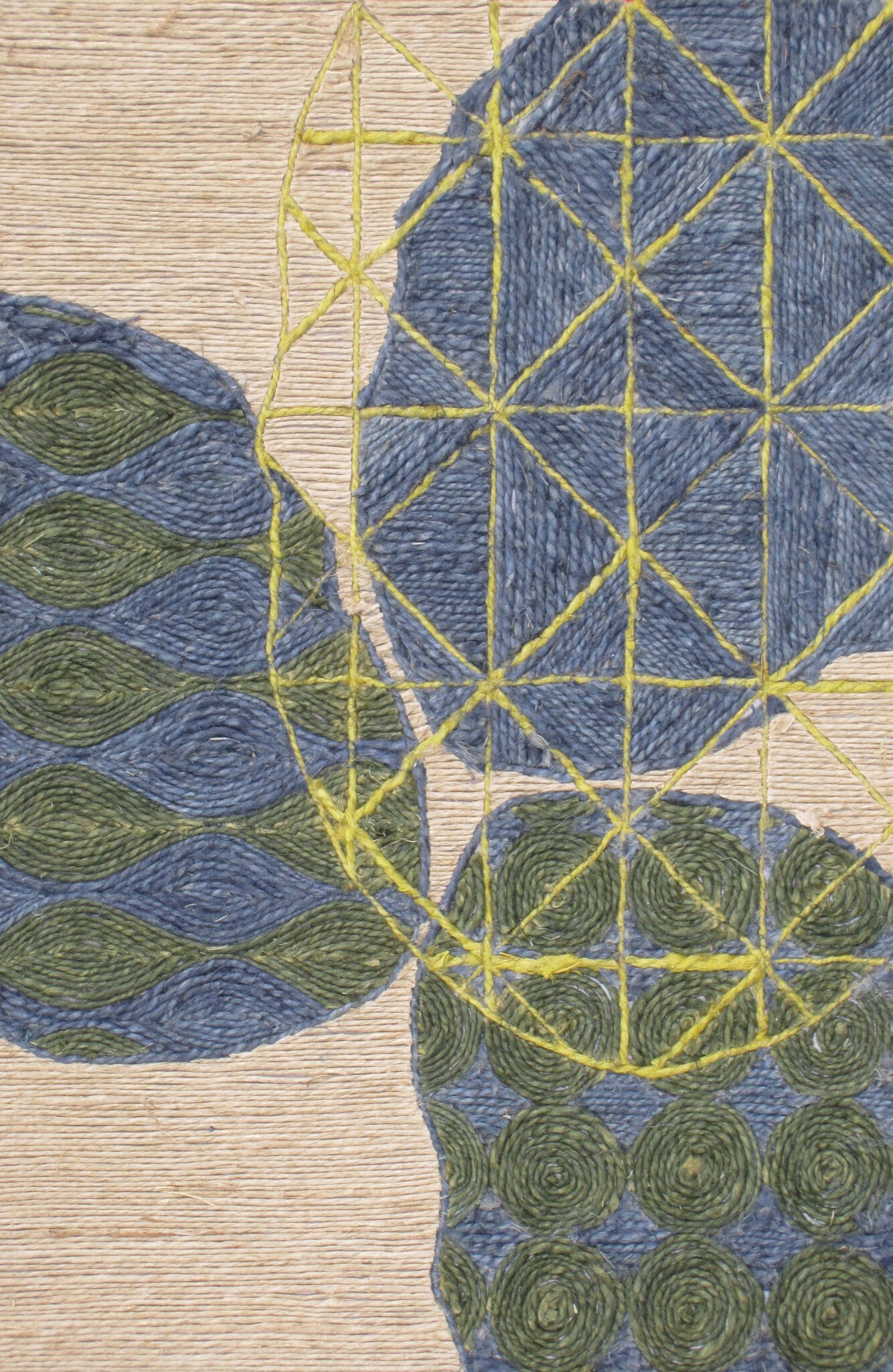 Abstracte compositie van hoofden en lijnen gemaakt van vlastouw dat met de hand gekleurd is.