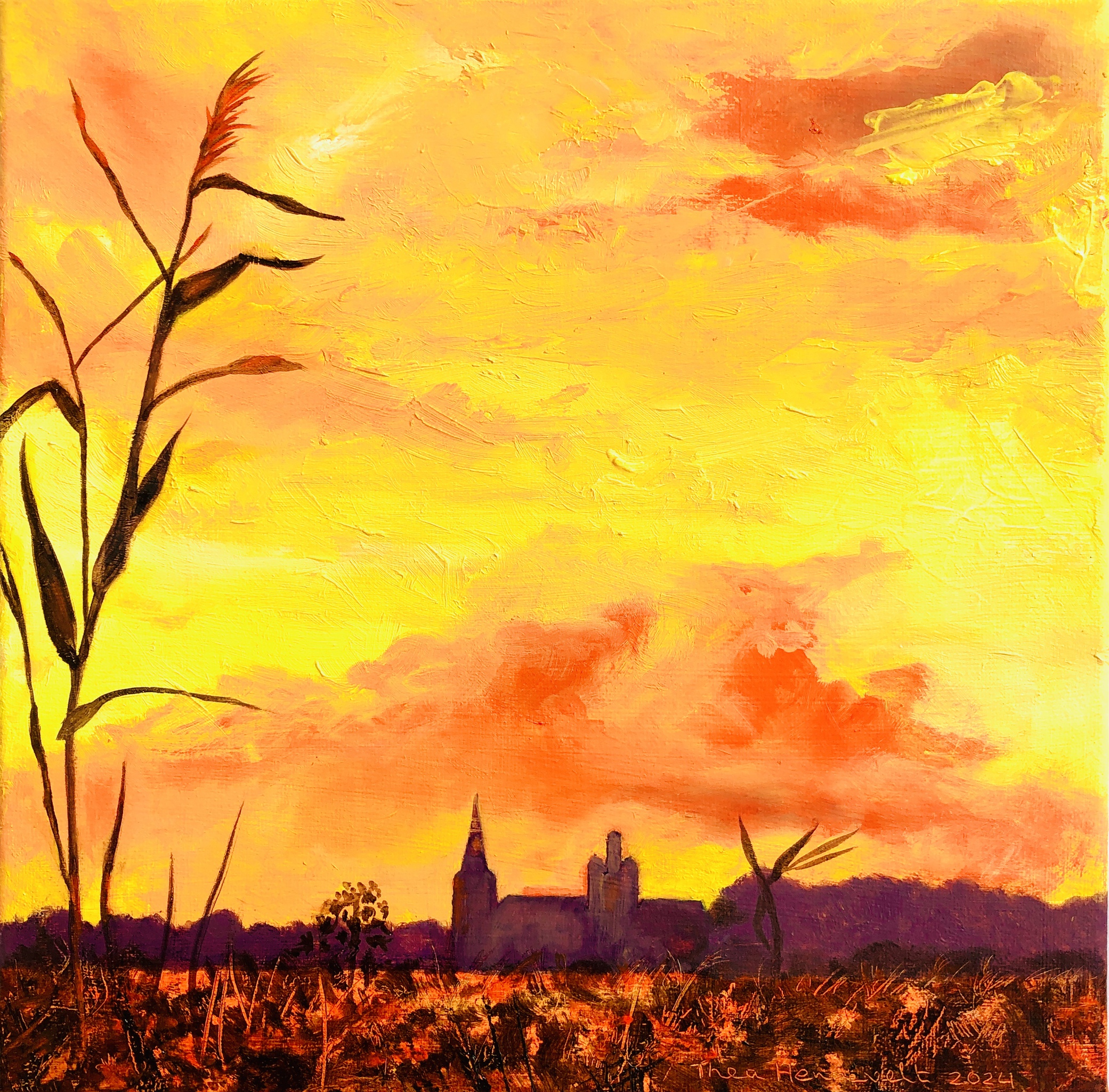 Kathedraal Avondrood Jans # #olieverf #kunst #bomen #landschap #bruin #wolken #kunstwerk #doek #weiland #lucht #riet #paars #sint #skyline #natuurschoon #landschapsschilderij #wwwtheahenneveltnl ‘s-hertogenbosch #landweg #wandelpad #zuidwal
