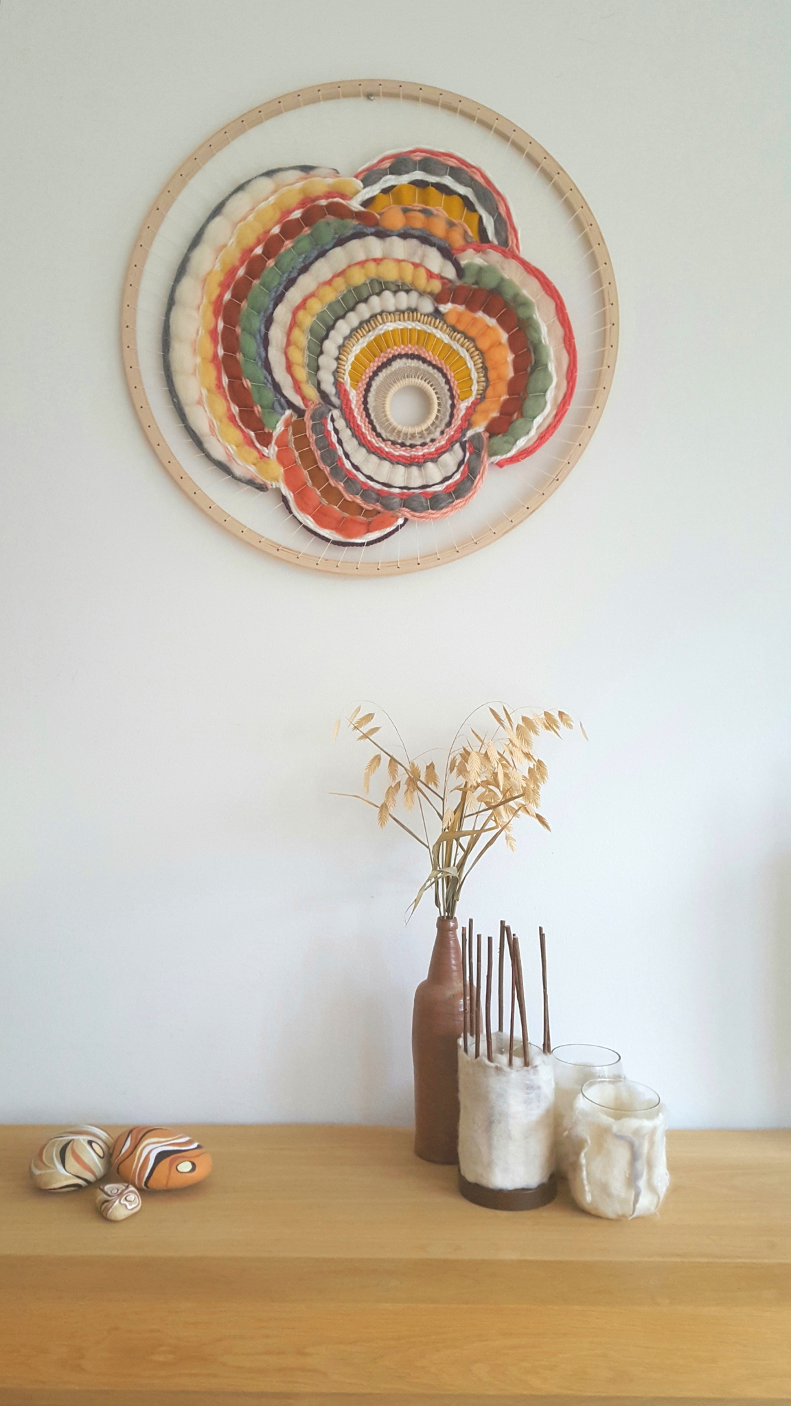 Weefwerk in houten hoepel met verschillende soorten wol
