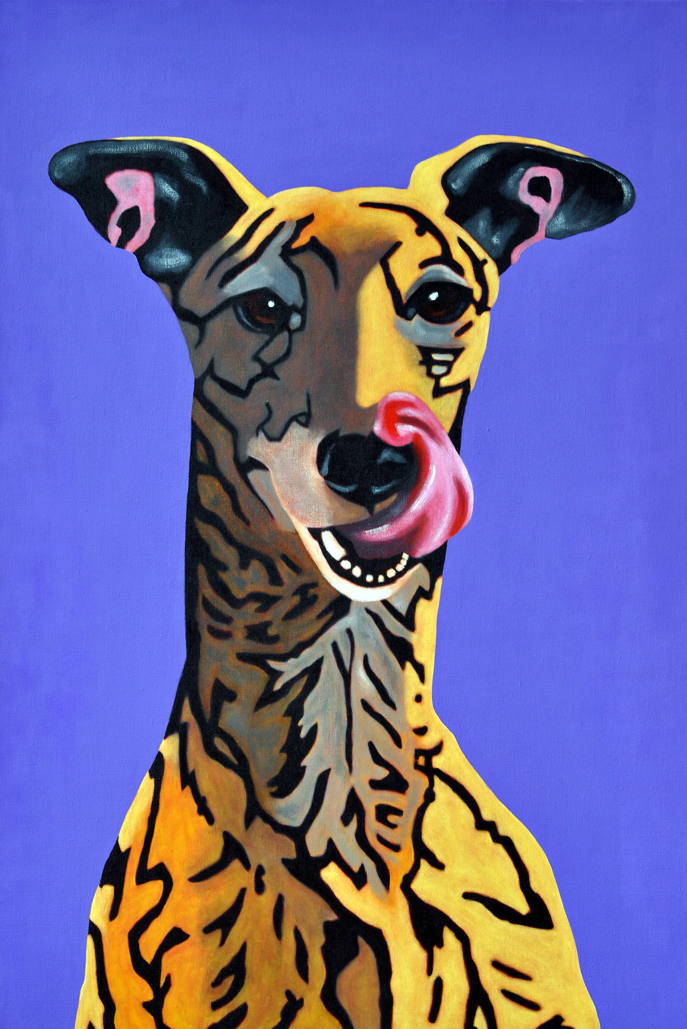 Grijs Rood Oranje Geel Zwart Paars Hond Tong Surreëel Lekker Beeldspraak Staand Windhond Frontaal Rechthoek Beeldtaal Gestroomd