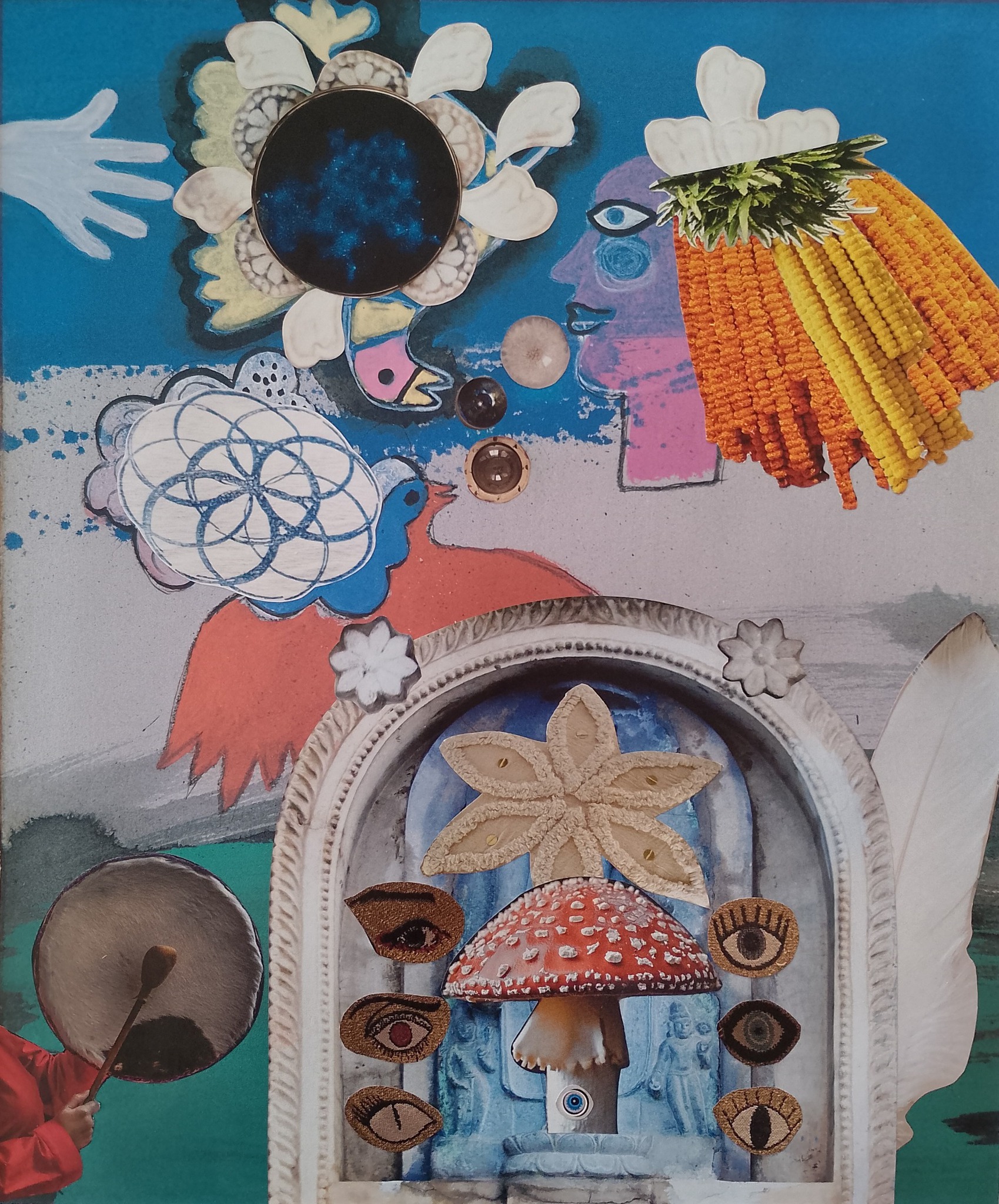 Bloemen Blauw Groen Vogel Paddestoel Ogen Poort Collage Papier Verhalend Surreeel Papierkunst Lijm Schaar Spiritueel Collagecoaching Coach Interpreteren Papierkunstenaar Intuïtief Flow Kleurig Bewegend Positief Boodschap