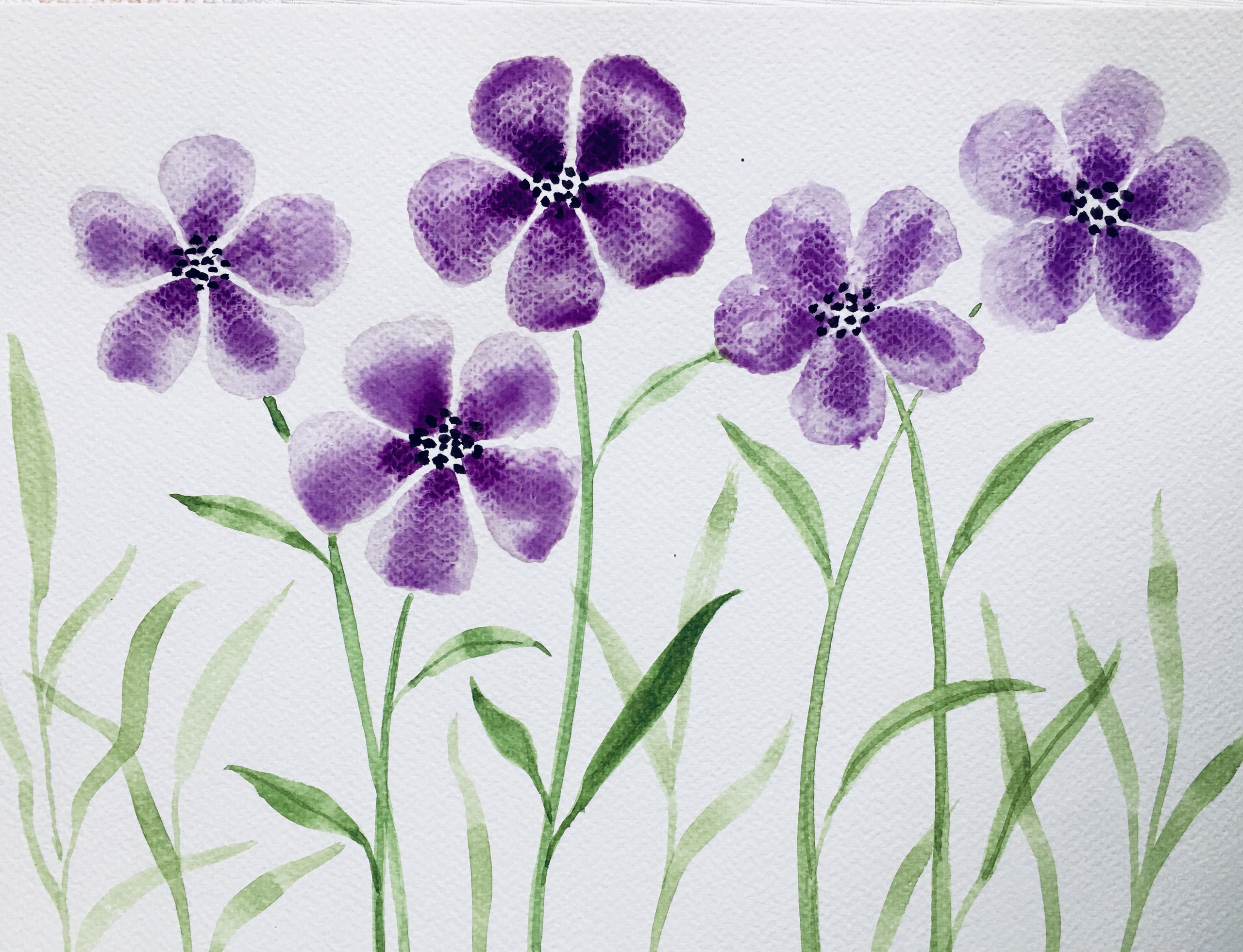Aquarelschilderij, 2024. Deze sfeervolle aquarelillustratie toont vijf paarse bloemen met ronde bloemblaadjes en donkere bloemharten. De bloemen zijn op elegante wijze verspreid over het beeld, elk verbonden aan een dunne, groene steel met langwerpige bladeren. De zachte penseelstreken en subtiele kleurverlopen geven de bloemen een dromerige uitstraling. De witte achtergrond versterkt de frisheid van het geheel en maakt het tot een rustgevende en decoratieve bloemencompositie.