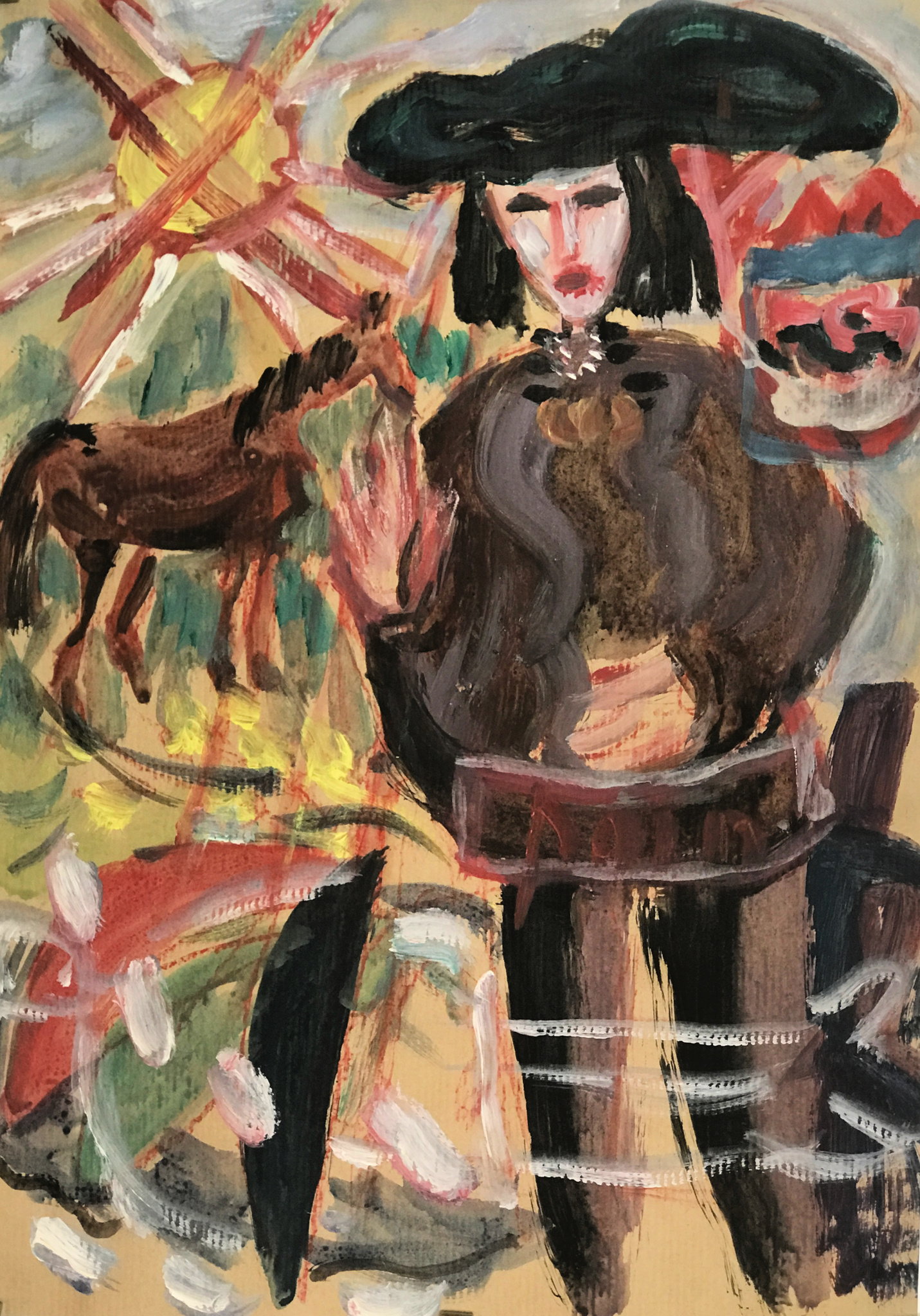 De rauwe energie vastgelegd van een eenzame figuur en zijn paard, omgeven door een achtergrond van vurige, kleurrijke luchten.