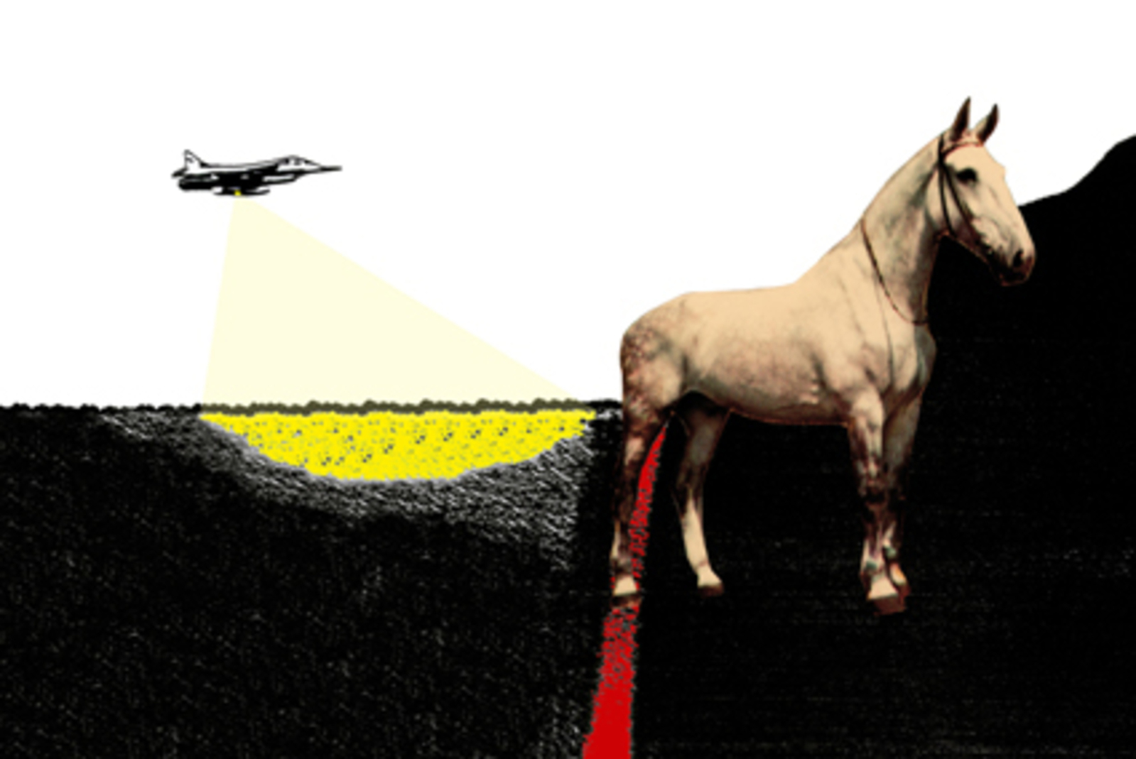 Surreeel Rood Geel Zwart Vliegtuig Verhalend Paard Collage Beige Grens