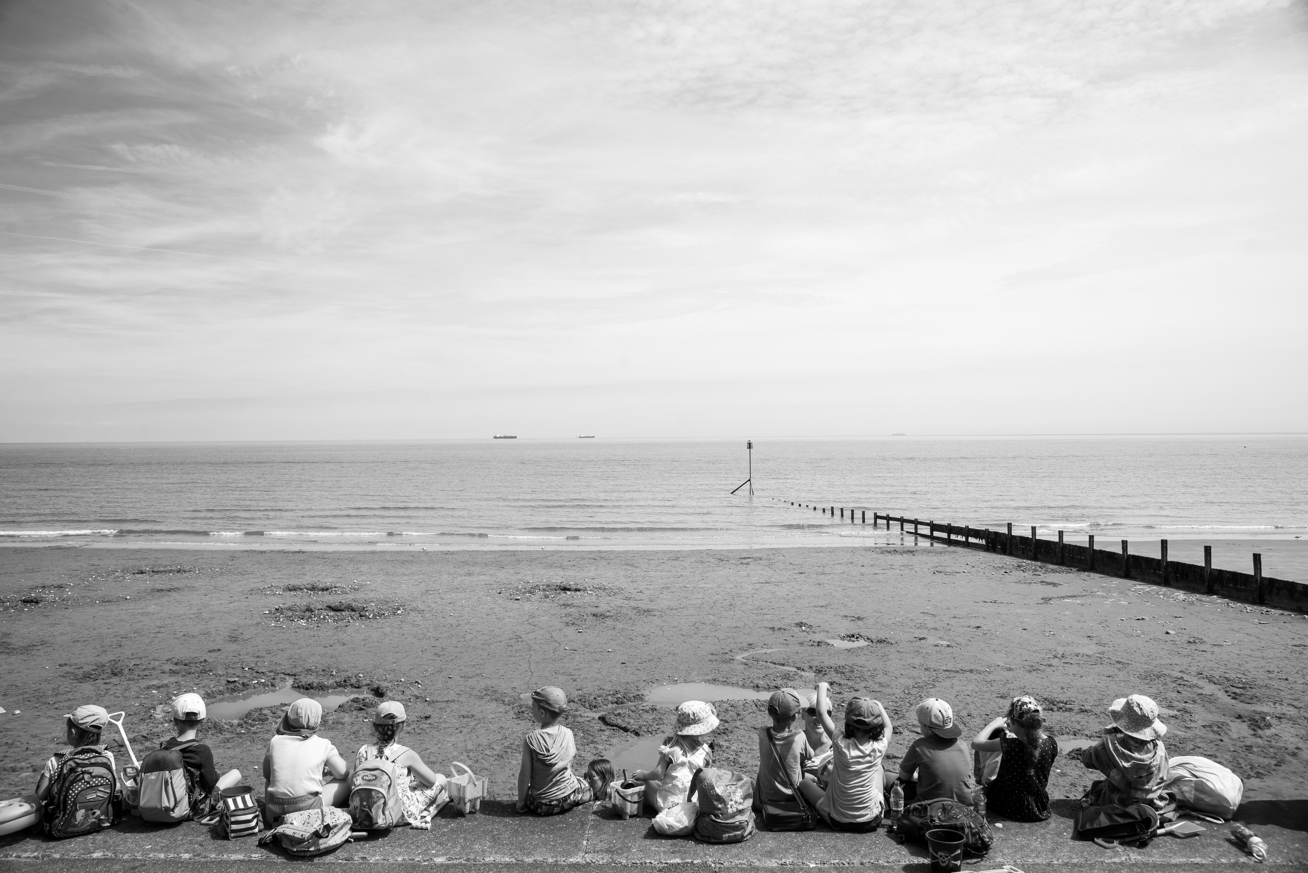 Schoolkinderen hebben een daguitje. Hier wachten ze netjes langs het strand aan de zuidkust van Engeland, Isle of Wight.
