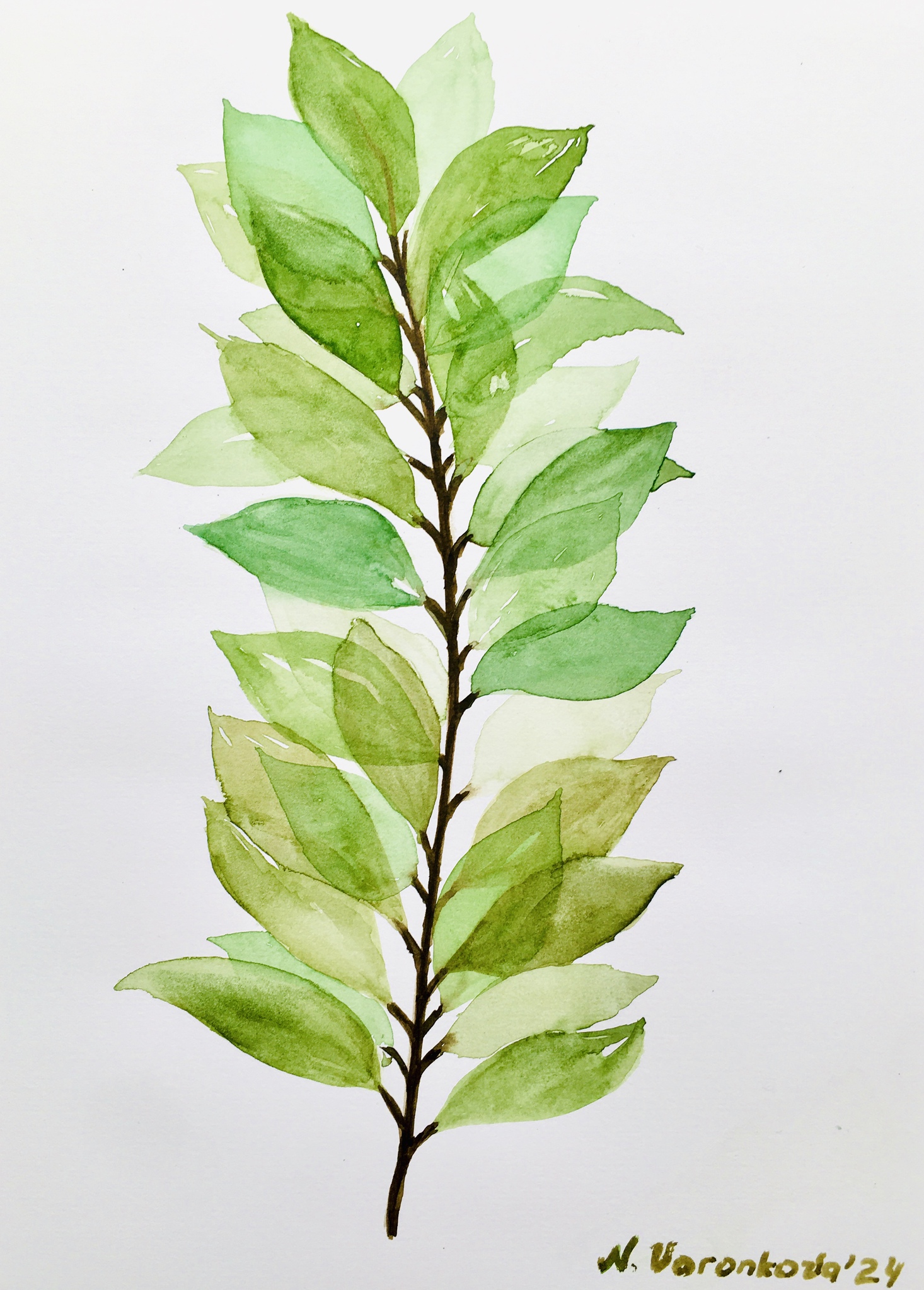 Aquarelschilderij, 2024. Deze aquarelillustratie toont een bladtak met symmetrisch geplaatste bladeren in verschillende groentinten, variërend van lichtgroen tot olijfgroen. De bladeren overlappen deels en zijn met transparante verf geschilderd, wat zorgt voor een gelaagd en natuurlijk effect. De witte achtergrond laat de frisse kleuren mooi uitkomen en geeft het geheel een lichte, rustgevende uitstraling. Een subtiele, botanische illustratie die eenvoud en elegantie uitstraalt.