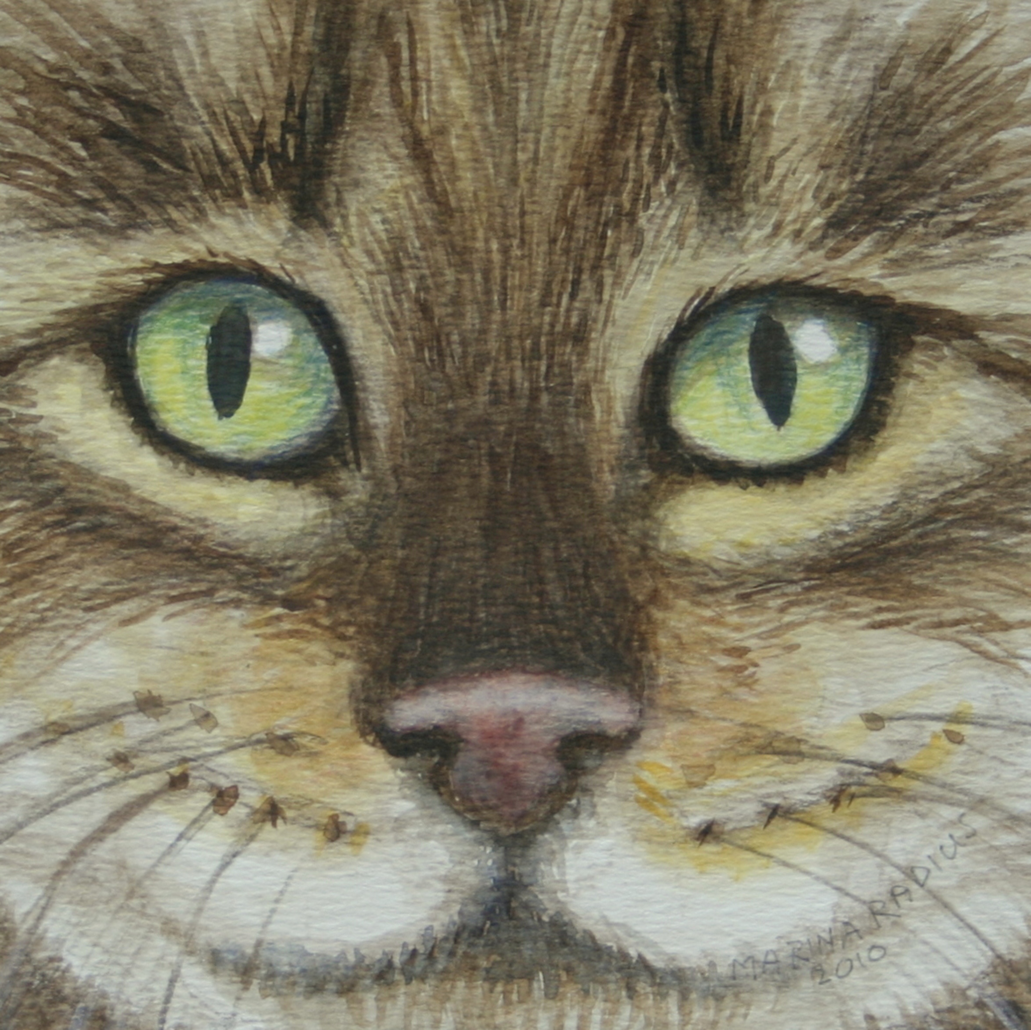 Poezenogen groen, aquarel/ kleurpotlood. Ingelijst met passe partout en glas 18x18 cm.