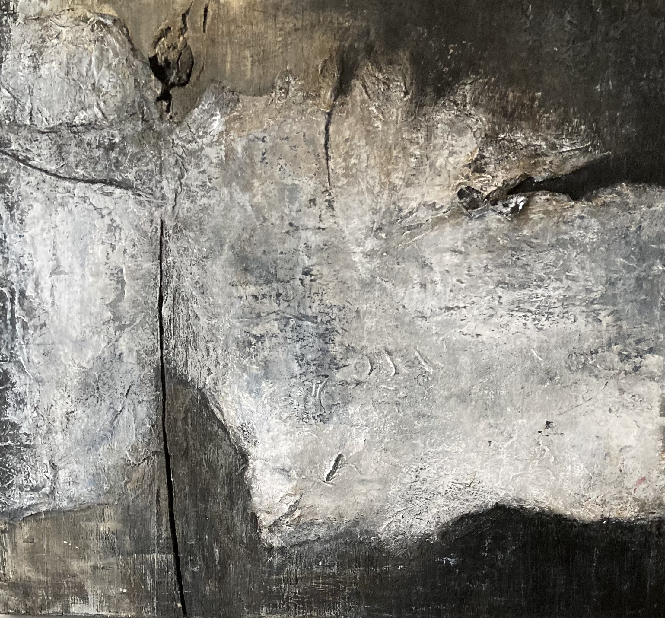 De ondergrond van dit werk is oud hout. Een impressie van oude oppervlakten bv. oude deuren, oude muren.