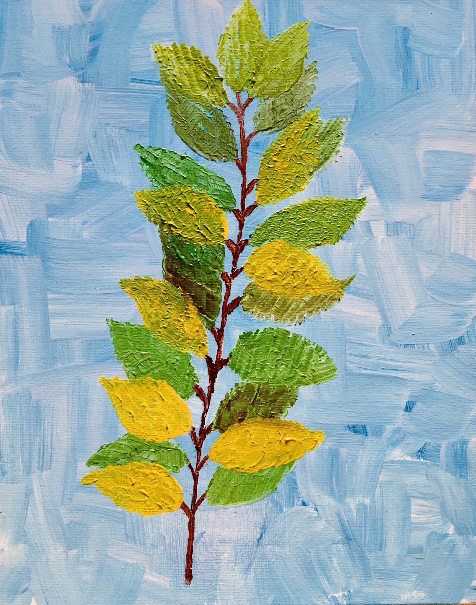 Schilderij Yellow Expressief Kleuren Oil Kunst Painting Bladeren Olieverfschilderij Moderne En Blauwe Leaves Tak Groene Kleurrijke Achtergrond Levendige And Gele Schilderwerk Botanische Impasto Bladen Natuurkunst