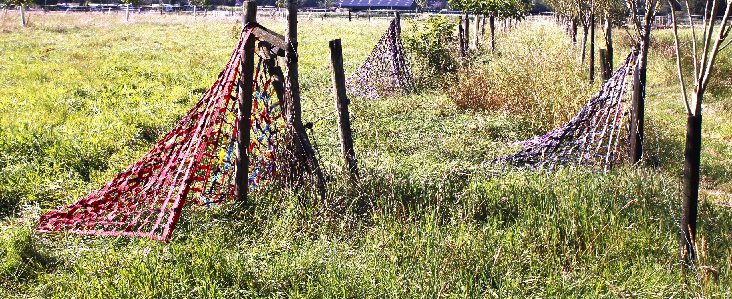 Tijdelijk verblijf 1 – ‘Waterdicht’ Drie elementen, tijdelijke, provisorische onderkomens. In alle haast opgezet om een minimum aan beschutting te bieden. Maar ja, hoeveel bescherming zullen ze kunnen bieden, met hun open structuur? Gemaakt van stroken oude lappen. Overal en nergens vandaan: afgedankte gordijnen, keukenlinnen, versleten kleding en andere vodden. Elk stukje textiel heeft zijn eigen geschiedenis. Ooit aangeschaft, jarenlang gebruikt, toen afgedankt.