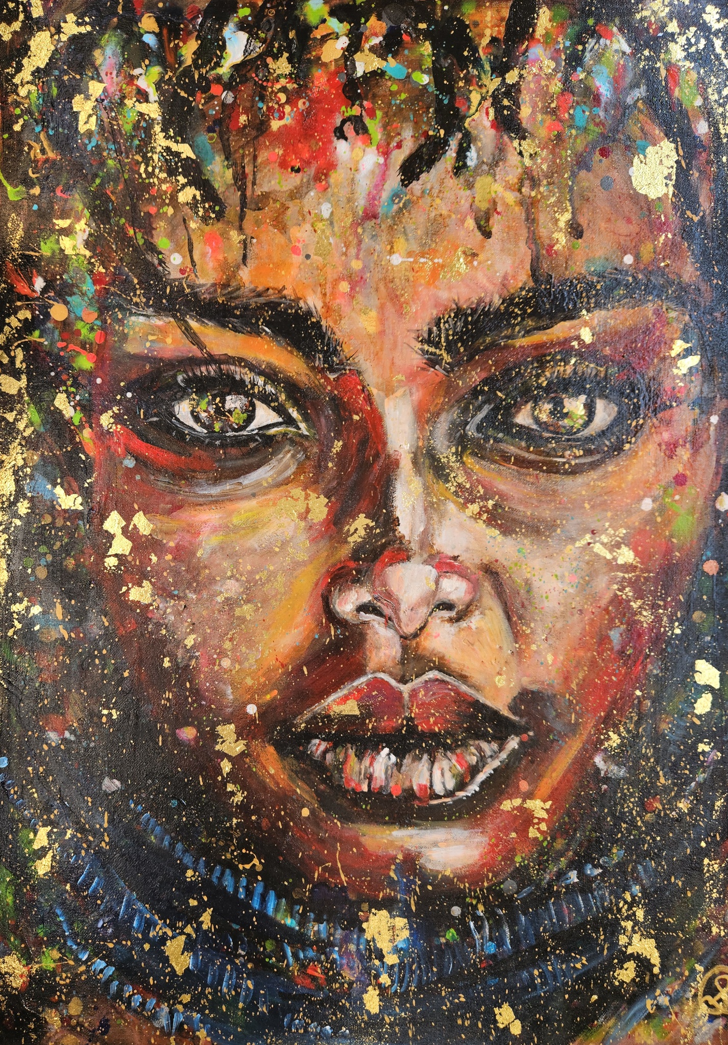 Afrikaanse vrouw met dreadlocks gemaakt met acrylverf en inkt. Ook is er gebruik gemaakt van bladgoud.