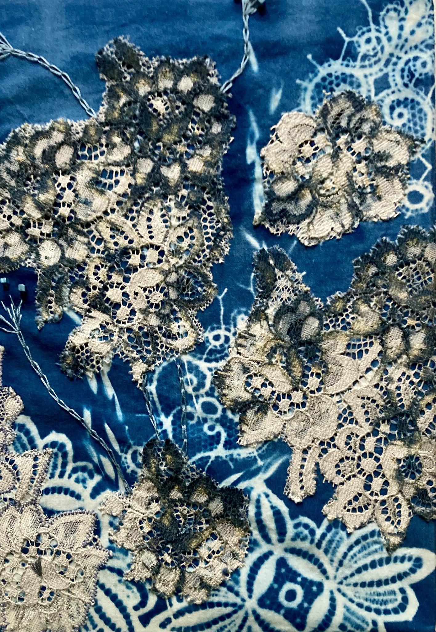 Boekomslag Bloem is ontstaan door een foto blauwdruk op ongebleekte katoen. Voor een deel geborduurd met kralen en met kant toegevoegd.