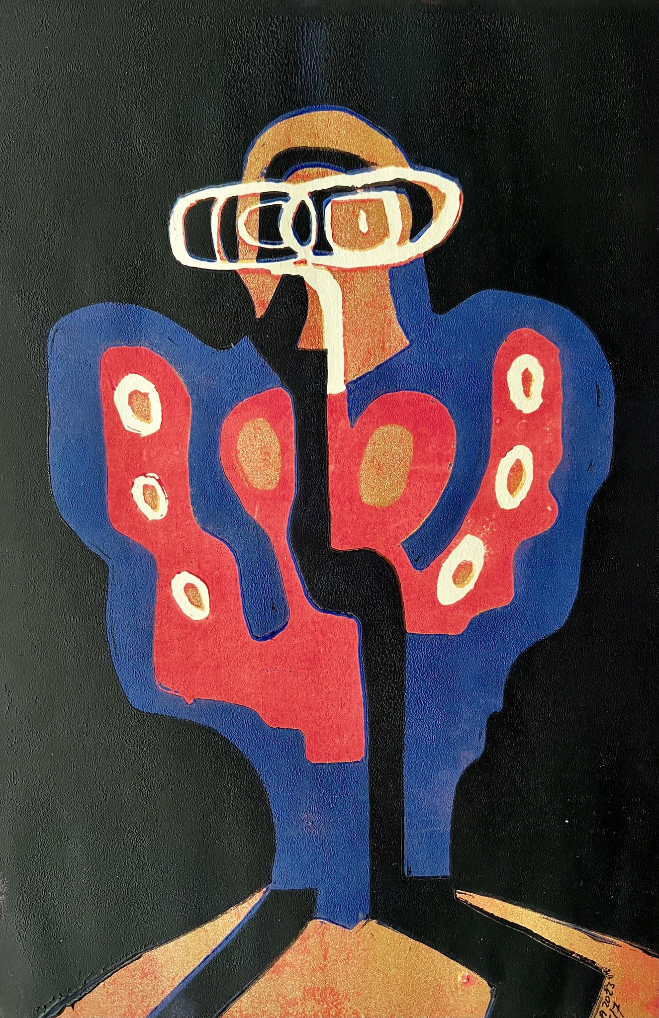 Linoleum afdruk gemaakt met verschillende sjablonen. Deze heet " Elvis on Guard 2", geinspireerd op een beeld op het eiland Flores, Indonesië.