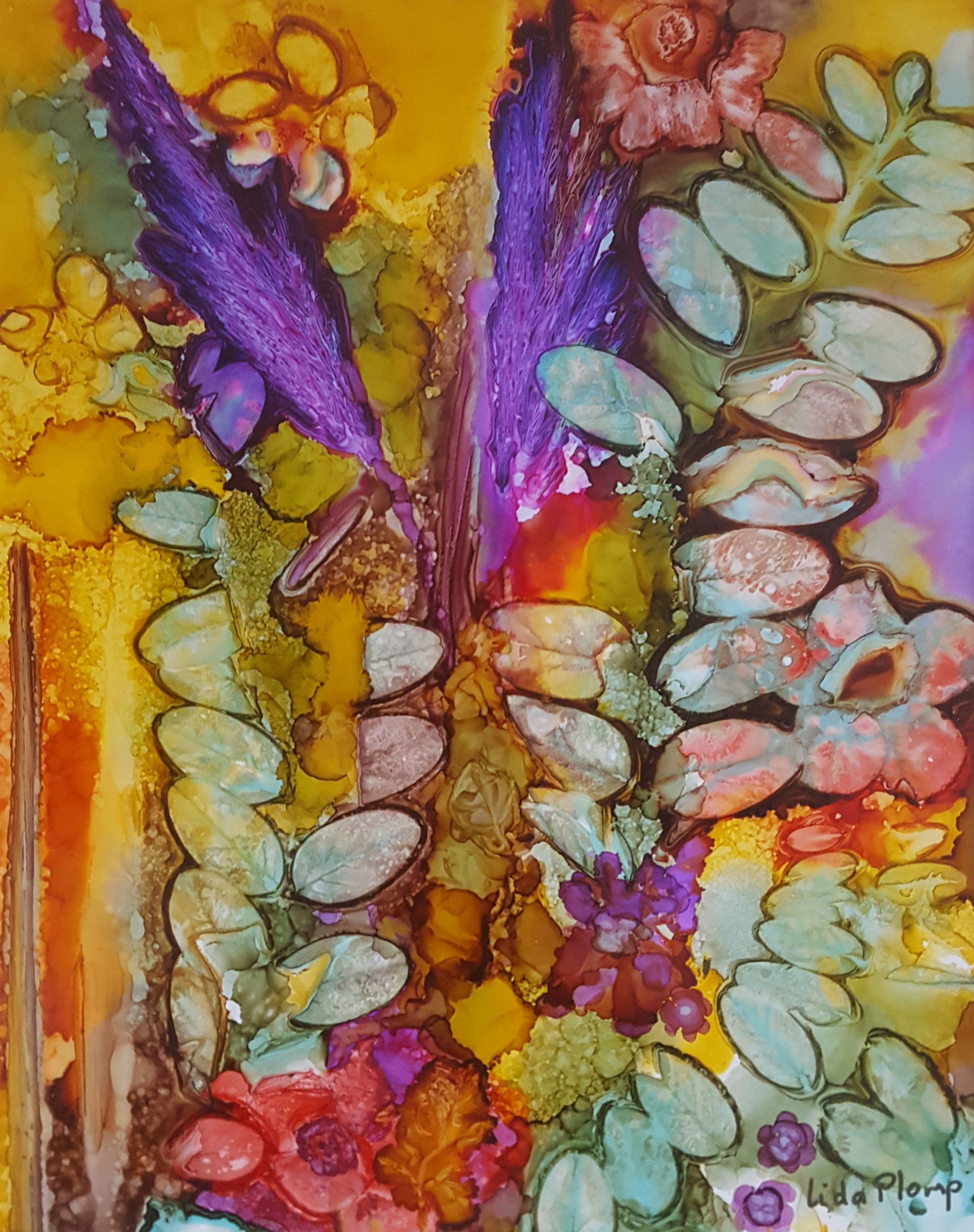 Abstract natuur met bladeren. Alcoholinkt op yupopapier in passepartout.