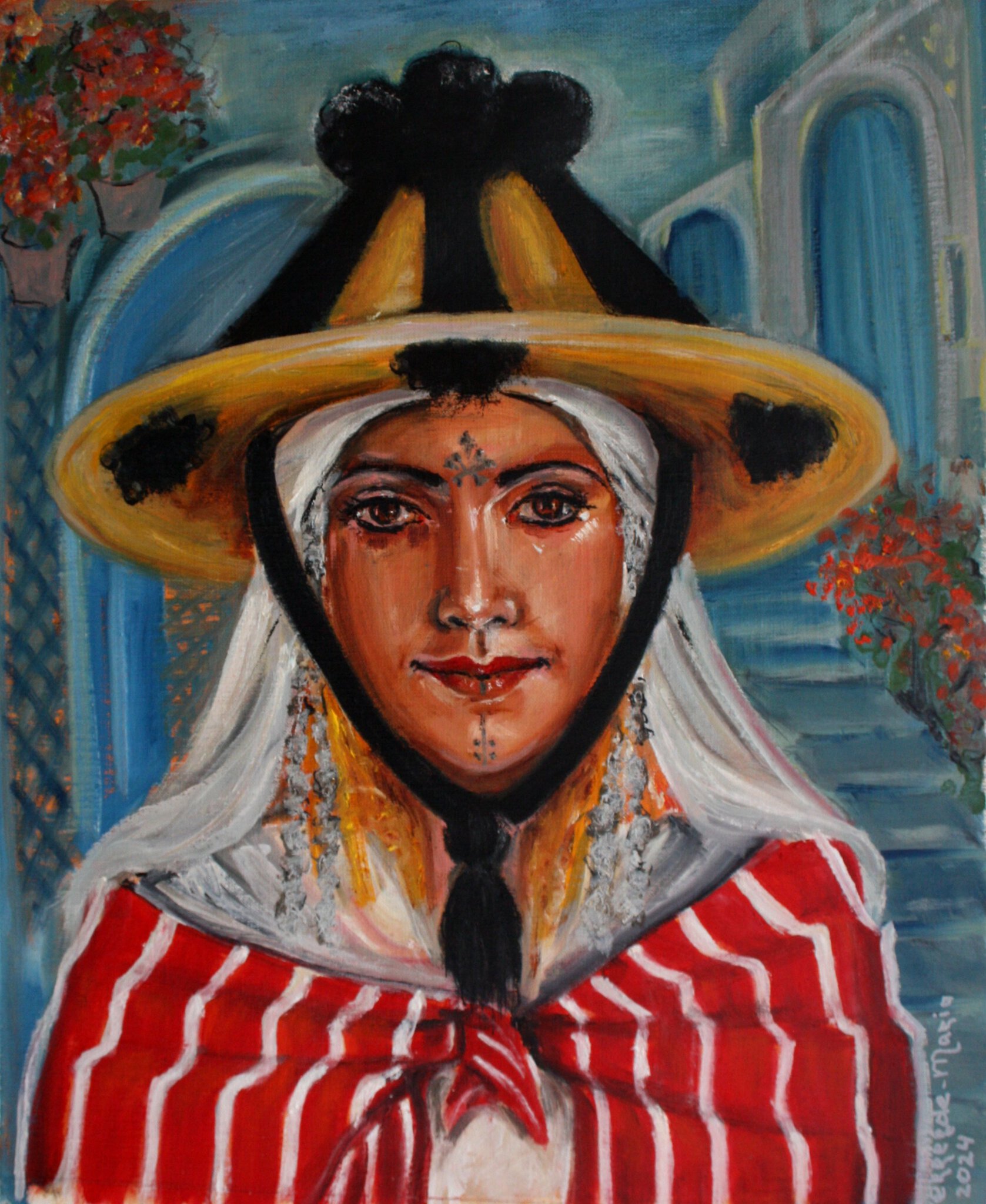 Imazigh vrouw met haar traditionele tattoo's, grote strooien hoed versierd met zwarte banden en pompoenen die ze draagt boven op een hoofddoek met zilveren sierraden en heeft altijd een rood wit geweven doek om. De Imazigh wonen in het rif gebergte in noord Marokko en de blauwe stad Chefchaouen is hoofdstad van deze regio.