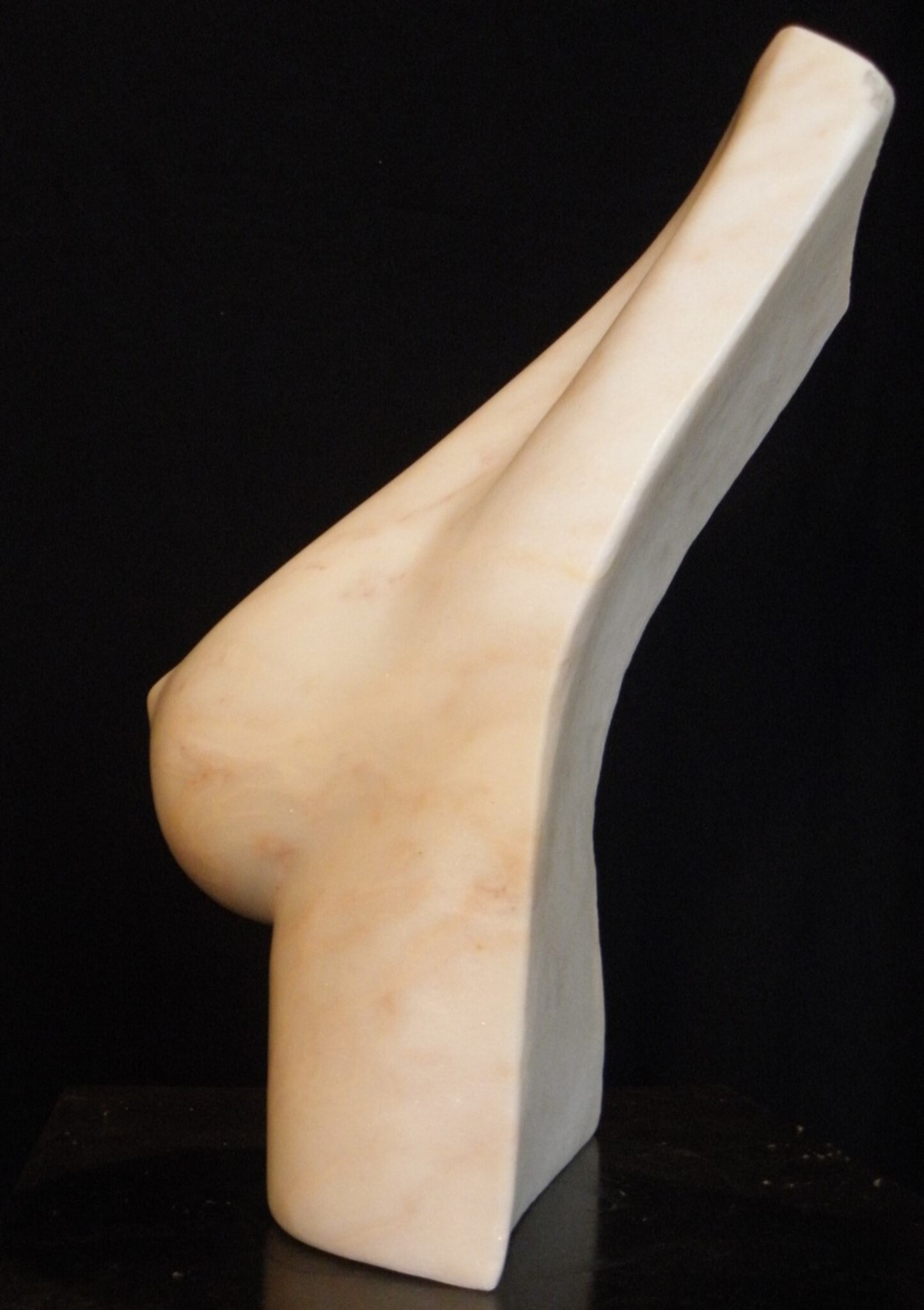 Borst gemaakt uit portugees marmer. Thema gekozen in het kader van Pink Ribbon en preventie onderzoek. de voorstelling is de omkadering als van een rontgenfoto gemaakt bij preventief borst onderzoek van borst en oksel. Meerdere fotos op te vragen
