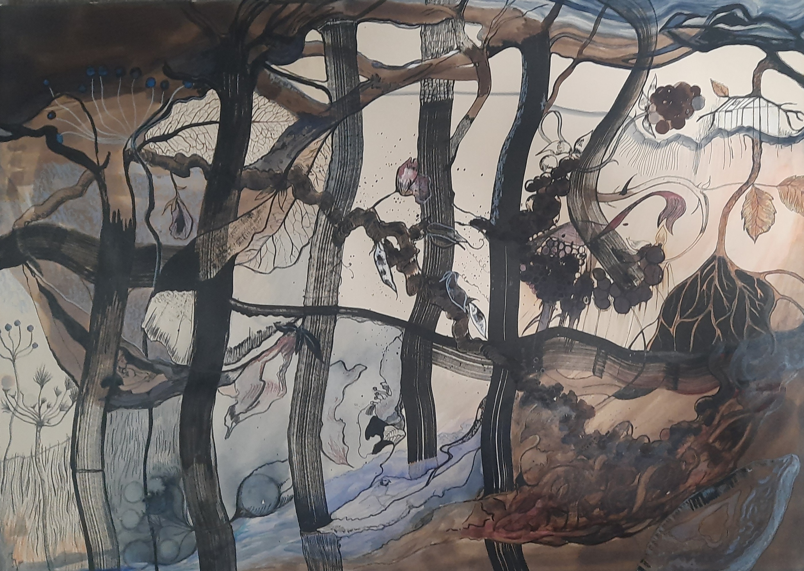 Inkt en kleurpotlood op gekleurd papier.