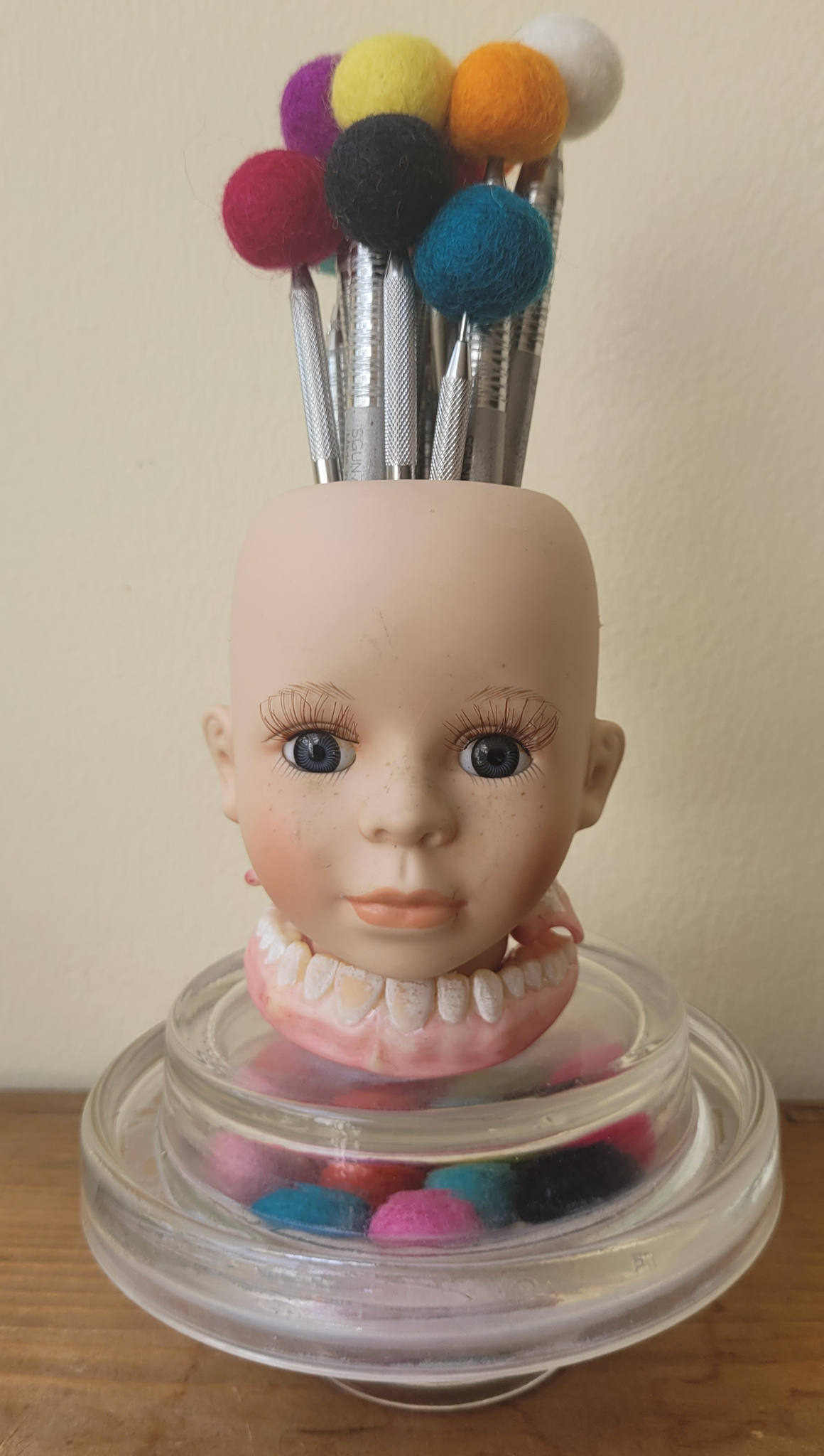 Er betstaan echt geweldige tandartsen. Ter ere van die van mij heb ik dit kunstwerkje gemaakt. Een plastic gebitje en een hoofdje vol met tandarts-tangetjes. Allemaal met een bolletje vilt er op. Heel zacht...!