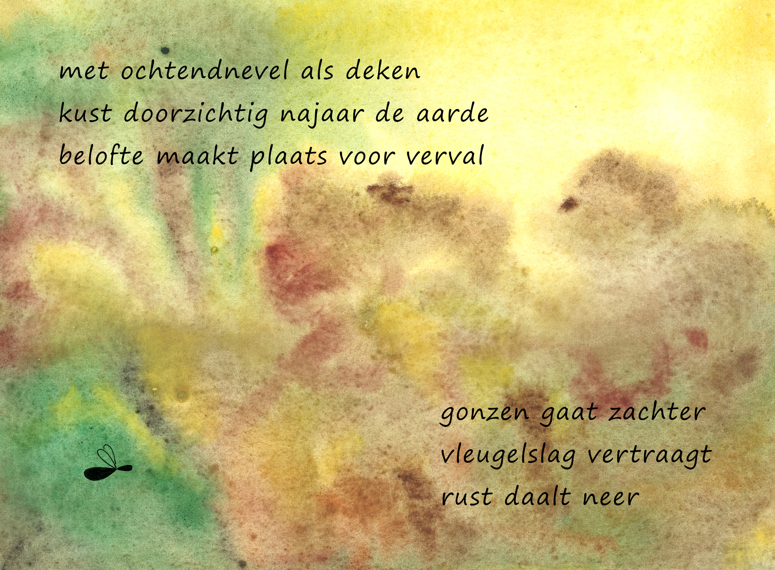 Pagina uit de leporello RONDGONZEND over hoe bijen de kringloop van het leven in seizoenen aanvliegen. Poëzie op gedigitaliseerde aquarel.