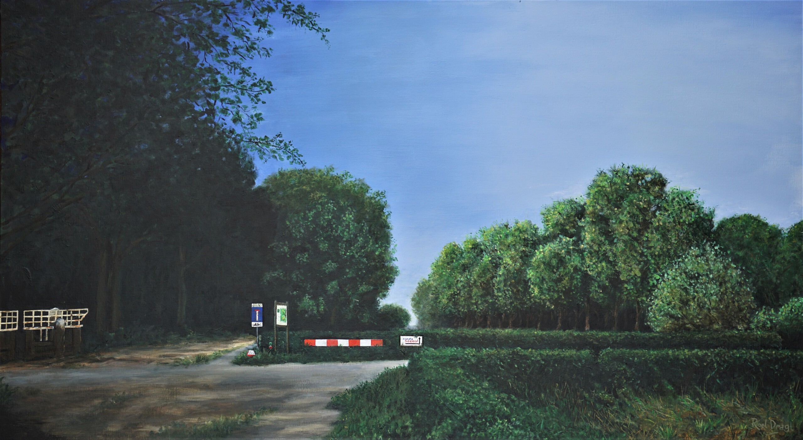 Acryl op doek. 100 x 180 cm. In 2022 kreeg ik het verzoek om een schilderij te maken voor Almelo Sociaal. Eervol voor mij als amateurschilder en als vrijwilliger die vaak in dit gebouw vertoeft. Almelo Sociaal werkt voor mensen met diverse problemen die niet goed in staat zijn om zelfstandig uit die problemen te komen. Ze komen voor dichte deuren, ze proberen wel wat maar komen in doodlopende wegen terecht, ze krijgen allerlei adviezen maar zien dan door de bomen het bos niet meer. Soms lijkt het of ze in een donker bos lopen en de weg niet kunnen vinden naar meer lichte omstandigheden. Gelukkig kunnen ze dan terecht bij Almelo Sociaal voor een goed advies en daadwerkelijke hulp. Het schilderij is gebaseerd op de situatie bij de Pook, einde Gravenallee in Almelo. Links op het schilderij zien we in het donkere deel de bovengenoemde obstakels, rechts het lichtere deel zonder problemen. Met enige artistieke vrijheid heb ik Almelo Sociaal in het schilderij kunnen verwerken als ondersteuner om bij het lichtere deel te komen.