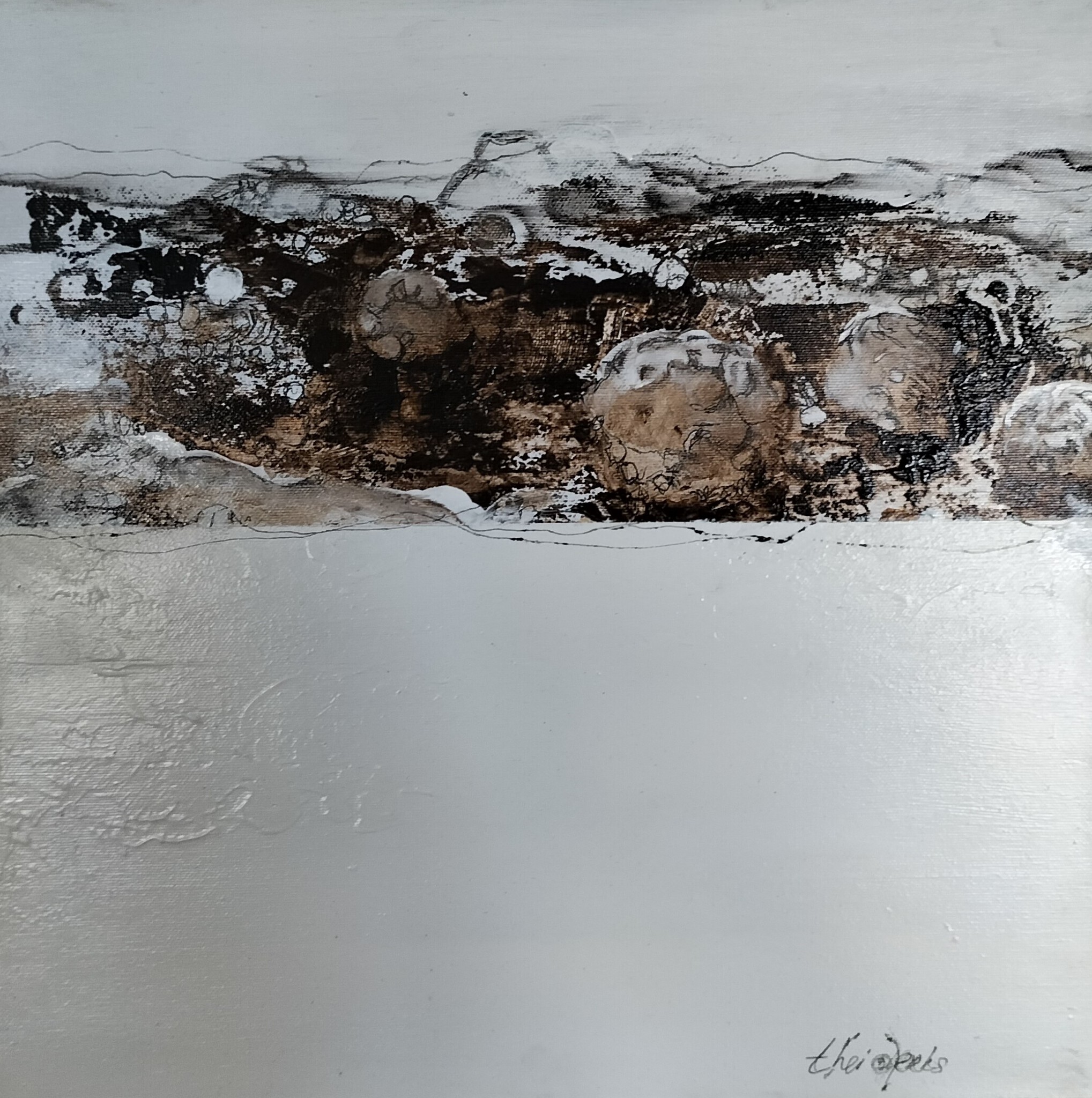 Mixed Media met als basis acryl op doek. 40 x 40 cm. Organisch Abstract, gebaseerd op natuurlijke gebeurtenissen en/of taferelen en geabstraheerd op eigen wijze verbeeld.
