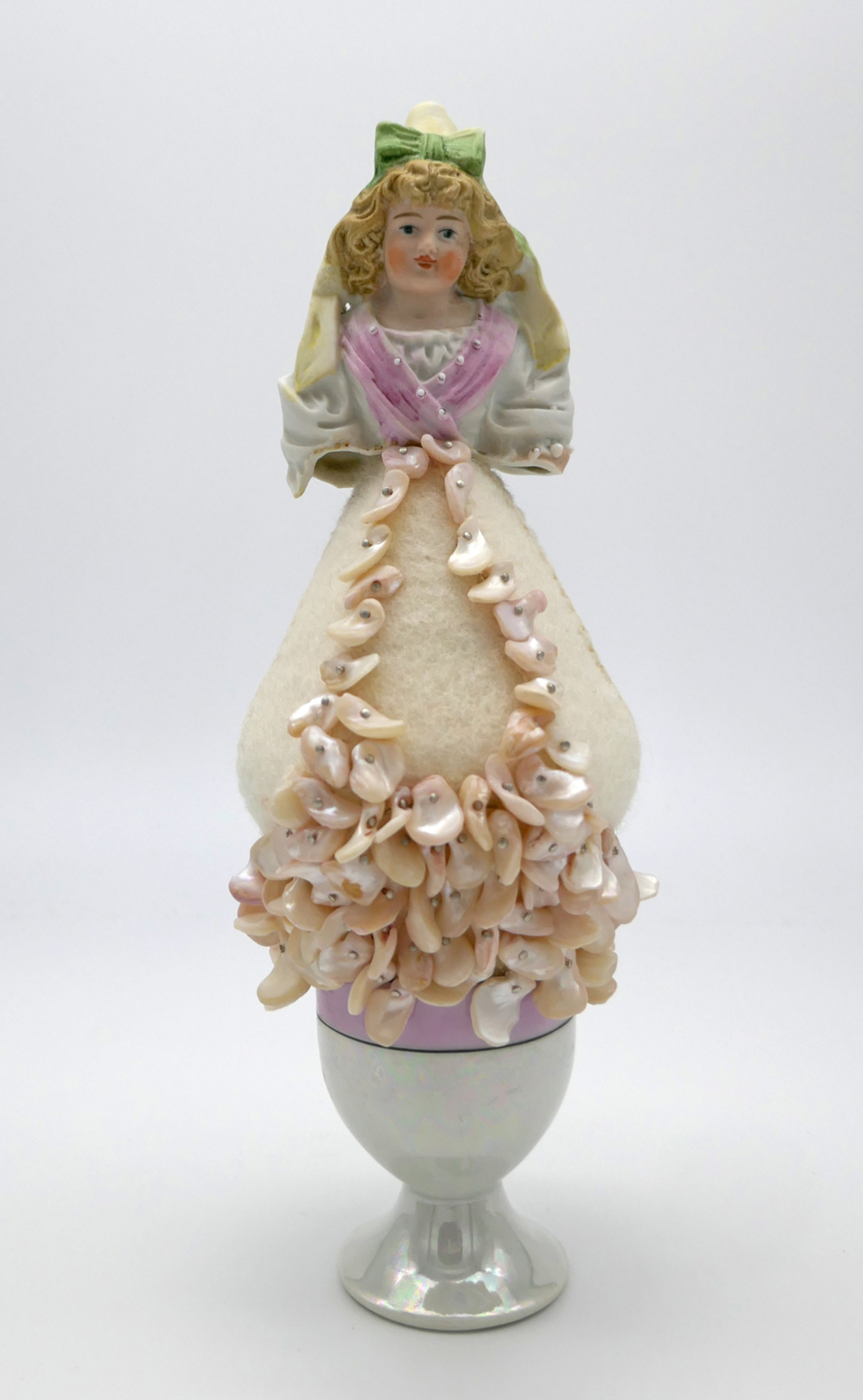Deels handgeverfd wol vilt, kapot keramiek, vilt, spelden, borduurzijde, kralen van schelp