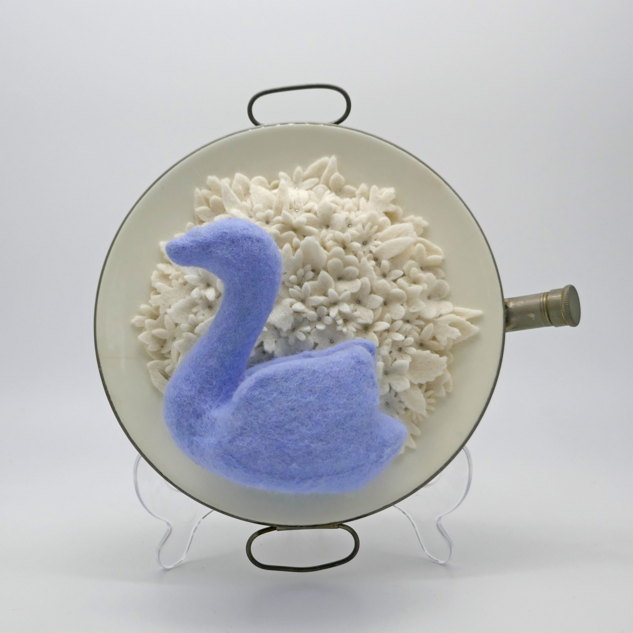 Deels handgeverfd wol vilt, keramiek+metaal baby-wam-houdt-bordje, speelgoed zwaan, vilt, spelden, borduurzijde, foam,