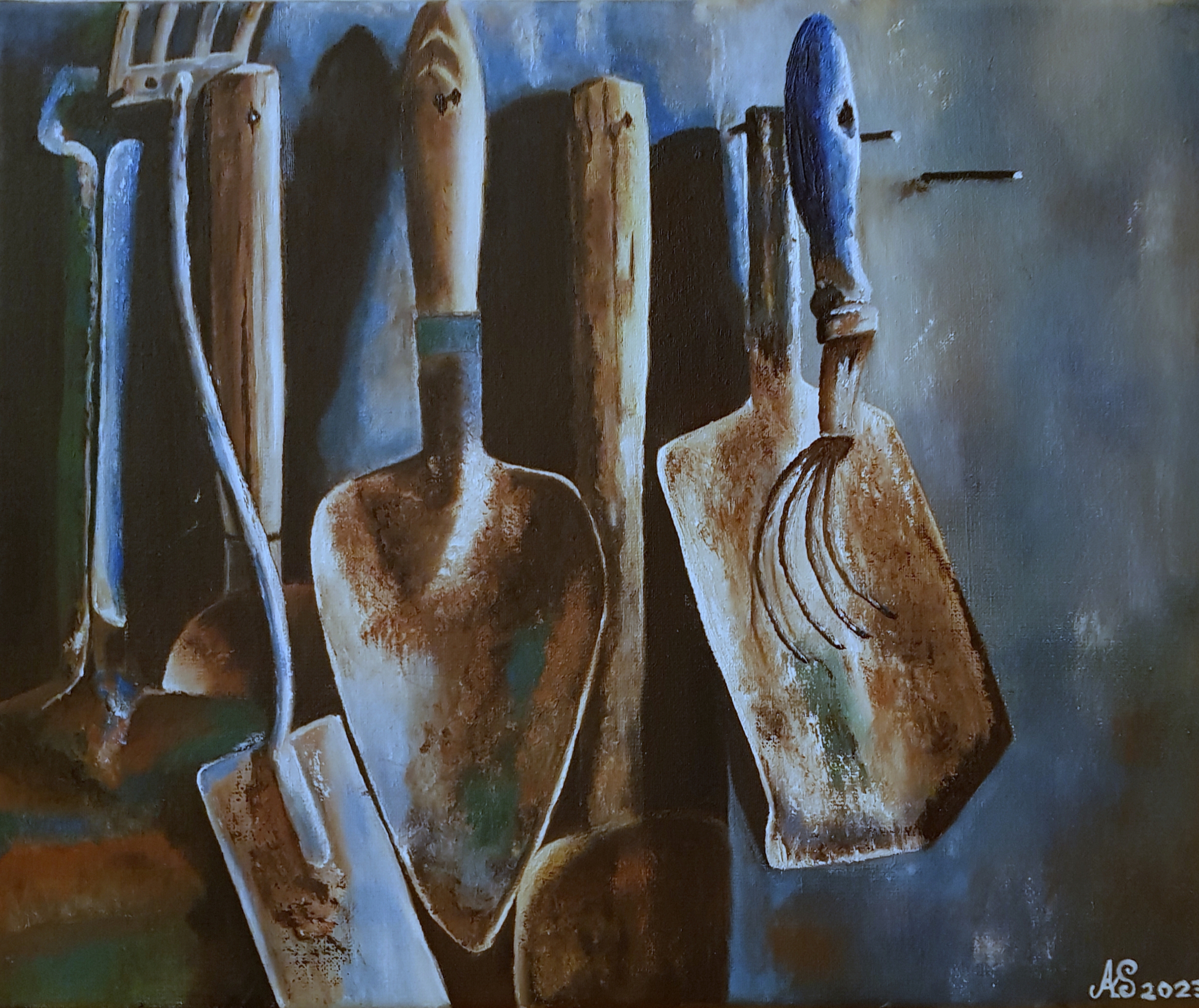 Garden Tools, olieverf. Dit kunstwerk is omlijst met een brocante zwarte houten lijst.
