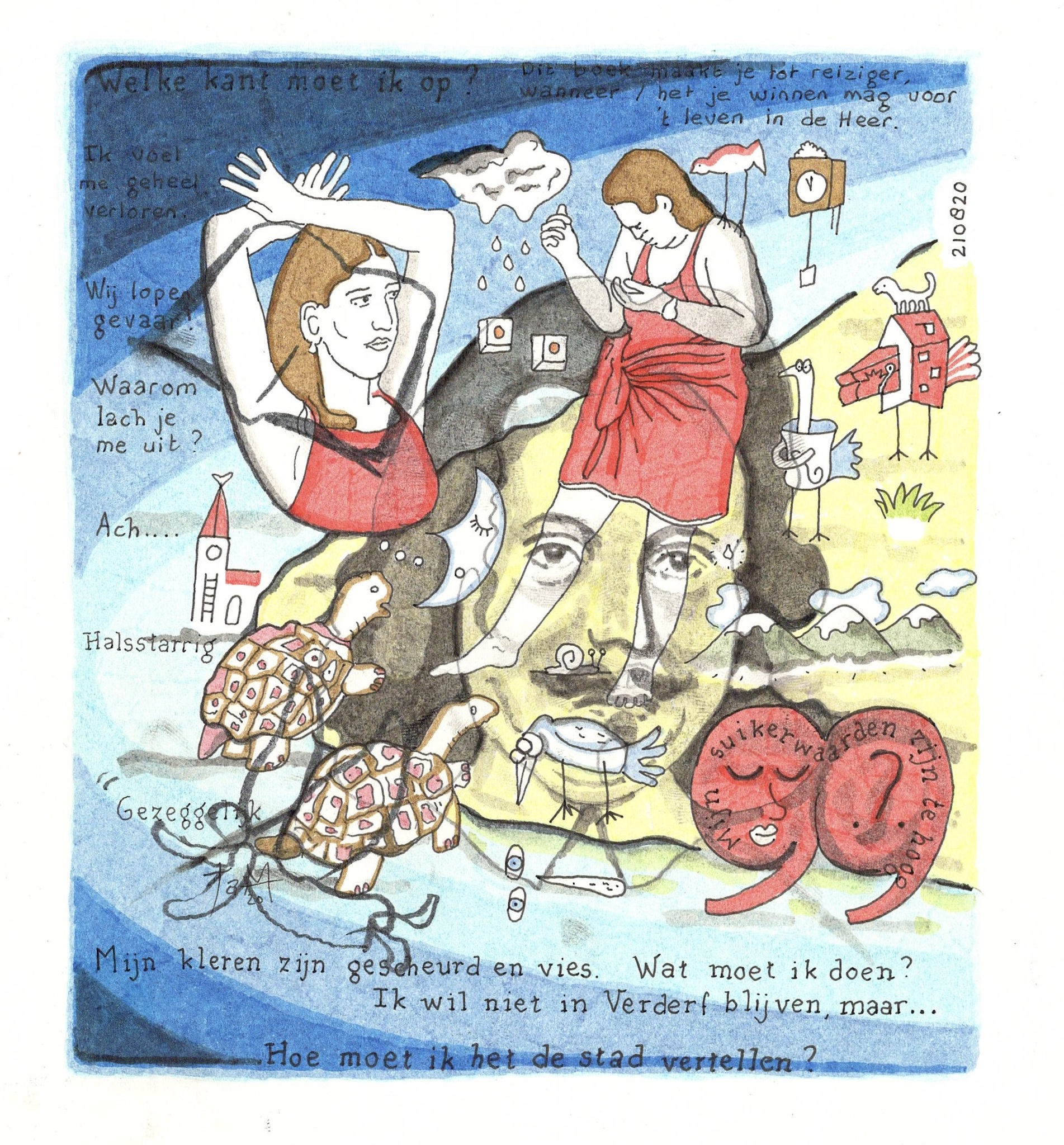 Christenreis 3 / 616. John Bunyan wandelt door de woestijn van deze wereld en ziet C. van huis weglopen. Lang heeft die geprobeerd om zijn onrust te verbergen, maar nu hakt hij de knoop door. Hij gaat weg uit Verderf. Maar laat C. ook zichzelf achter als hij richting woestijn vertrekt?