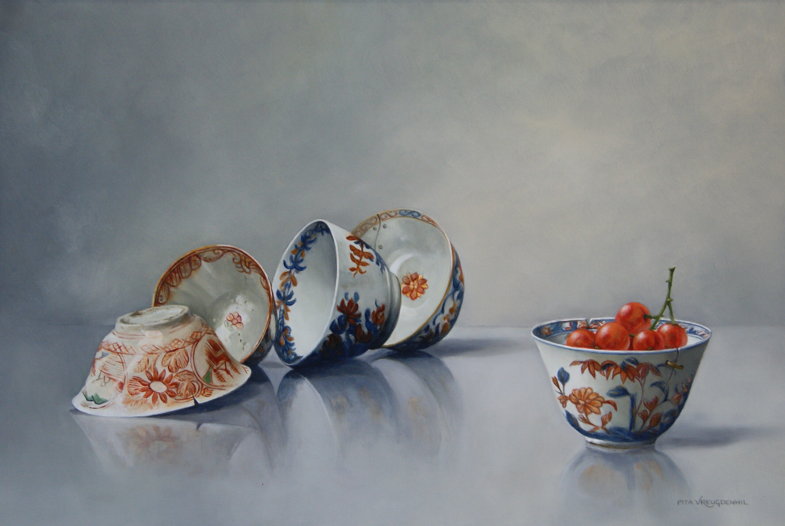 Schilderij Olieverf Paneel Spiegeling Spiegelend Ingelijst Vijf Chinees Besjes Imari Kommetjes Beschikbaar Tekoop Amsterdamsbont