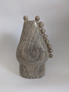Een vaas met bollen en heel veel lijnen. De lijnen zijn gezet met een keramiekpotlood en daarna een transparante glazuur erover.