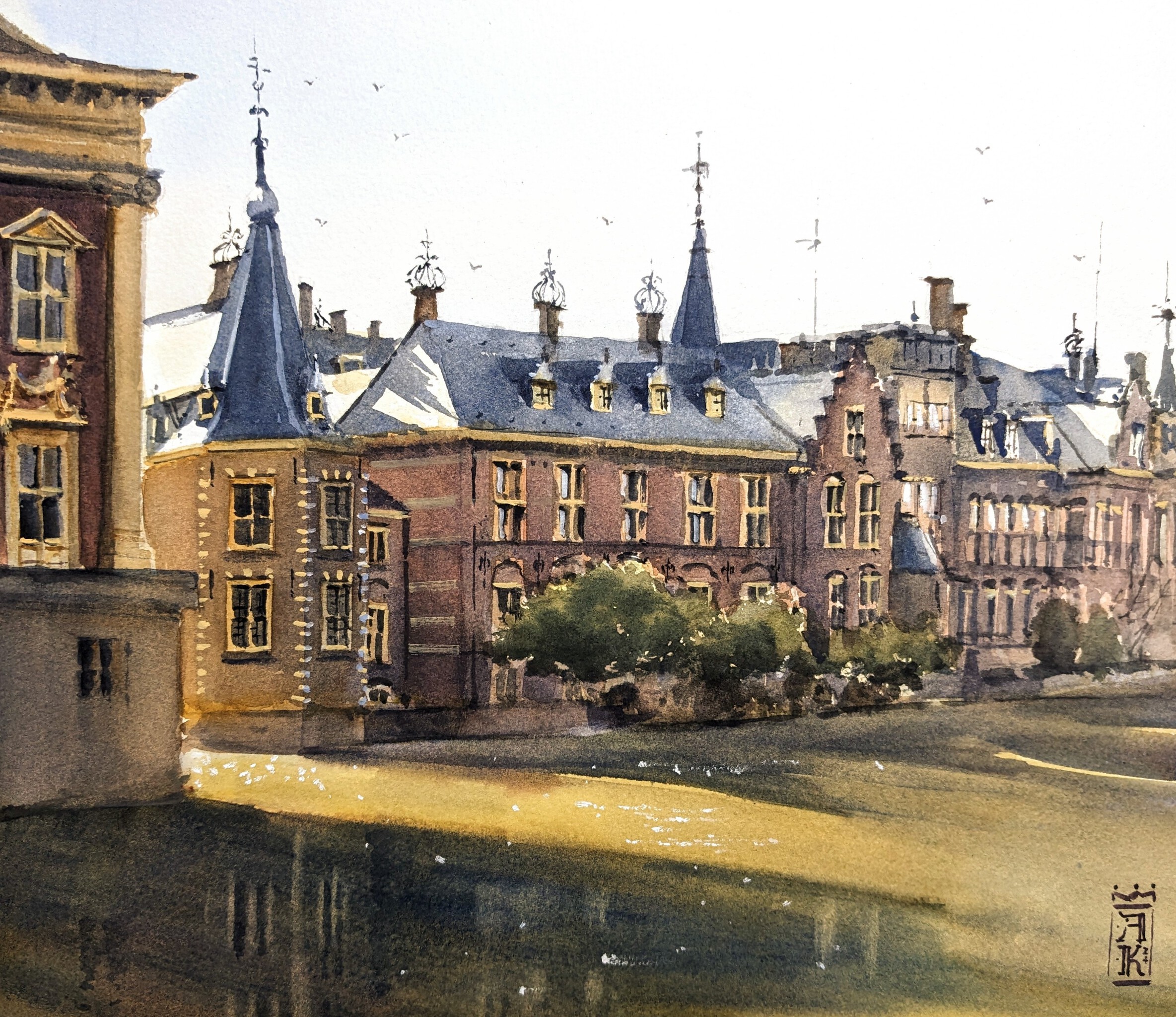 Schilderij Aquarel Realistisch Painting Architectuur Architecture Watercolor Stad Stadsgezicht City "den Haag" Binnenhof Hofvijver Torentje "the Mauritshuis Hague"