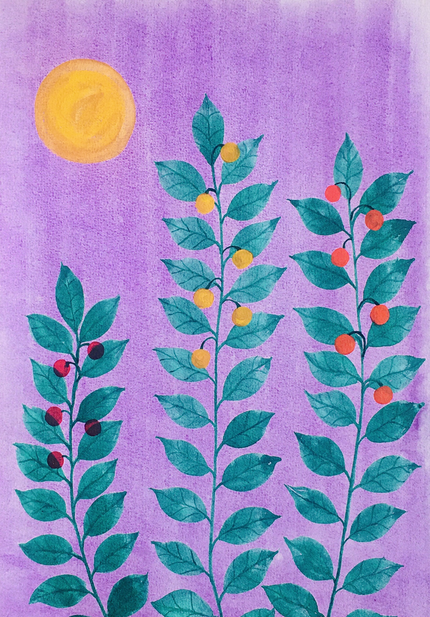 Aquarelschilderij, 2024 Deze levendige aquarelillustratie toont drie groene planten met symmetrisch geplaatste bladeren en felgekleurde ronde bessen in rood, oranje en geel. Op de achtergrond straalt een grote gele zon tegen een paarse lucht, wat een sterk kleurcontrast en een magische sfeer creëert. De combinatie van natuurmotieven met felle kleuren geeft het beeld een speelse en fantasierijke uitstraling die doet denken aan een droomachtig landschap.