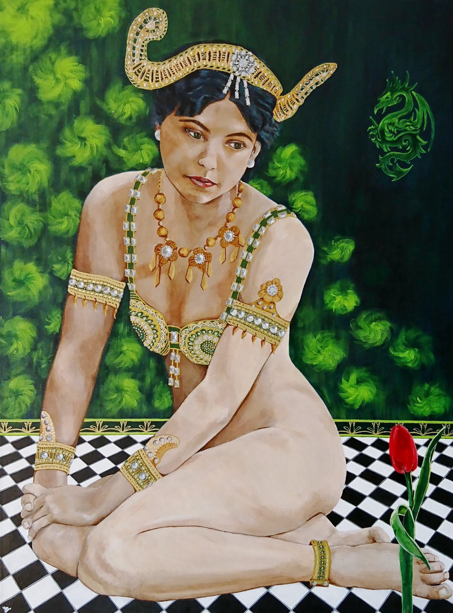 Mata Hari (Margaretha, Marleentje Zelle); danseres, mysterieus, onbevreesd, spionne? Ons Marleentje heeft heimwee naar Holland. Alle sierraden in goud- en zilververf.