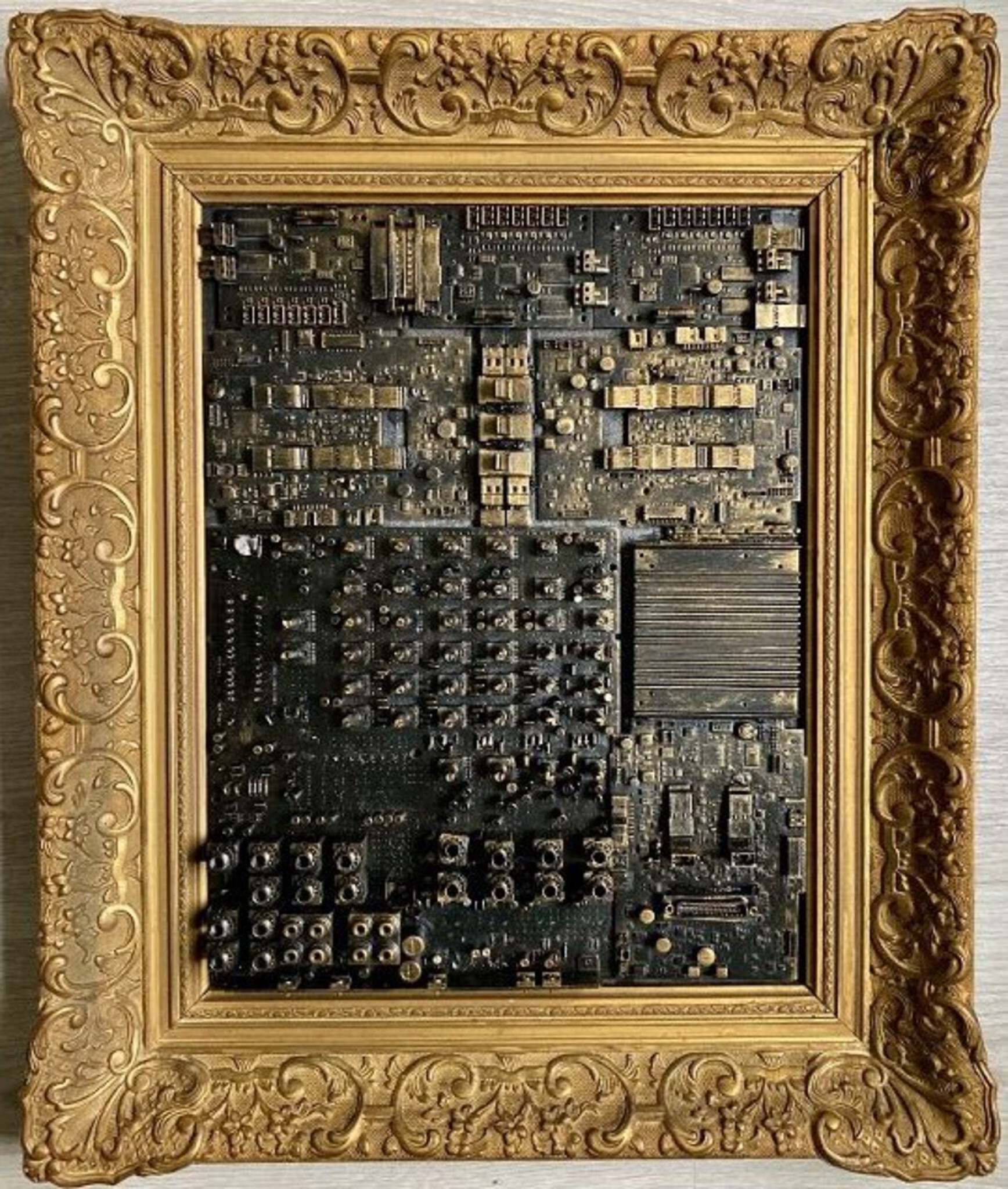 Gemaakt van een antieke schilderijlijst met oa. een muziek mengpaneel en computeronderdelen.