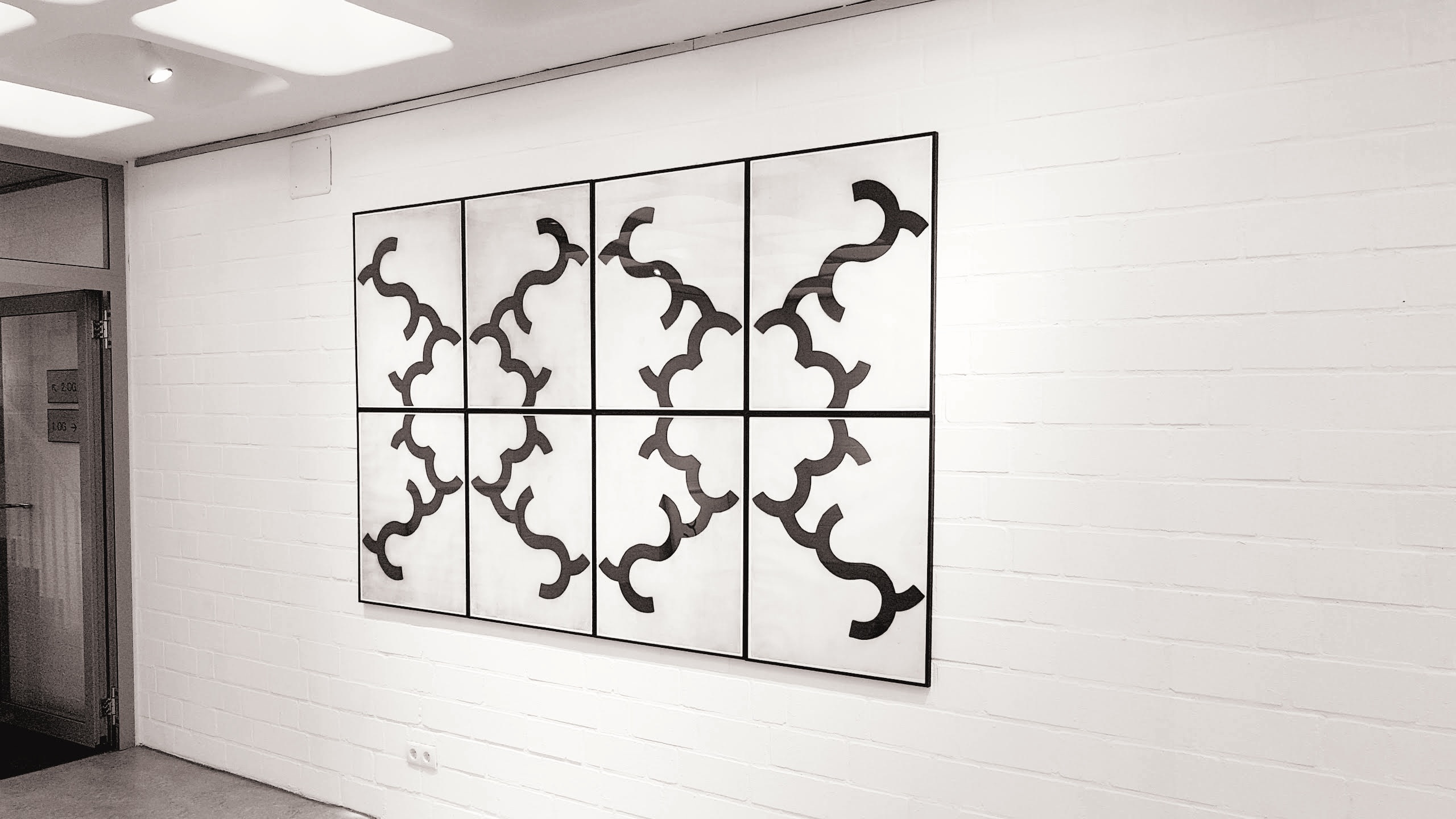 Vier maal twee spiegelende prenten. Droge naald. Gedrukt op Hahnemühle papier. Perfect aansluitend vormen ze een zich herhalend patroon. Hier zoals te zien geweest in Museum Kalkar, Duitsland. Het werk is ook te zien geweest in Pulchri, Den Haag en Kunstliefde, Utrecht. Daar hing het vertikaal.