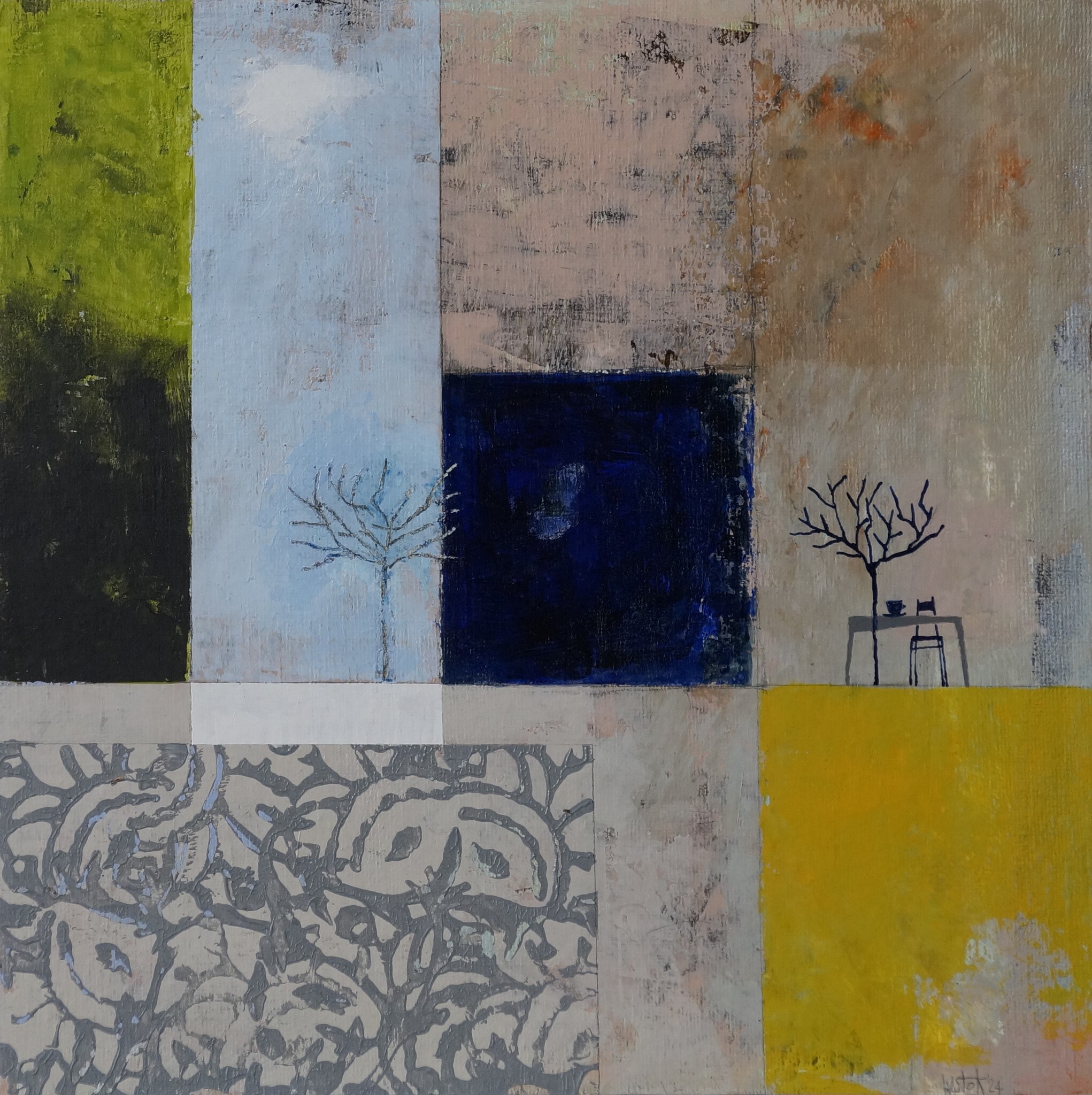 Koffie in de tuin, doek op paneel met witte rand en incl. witte lijst