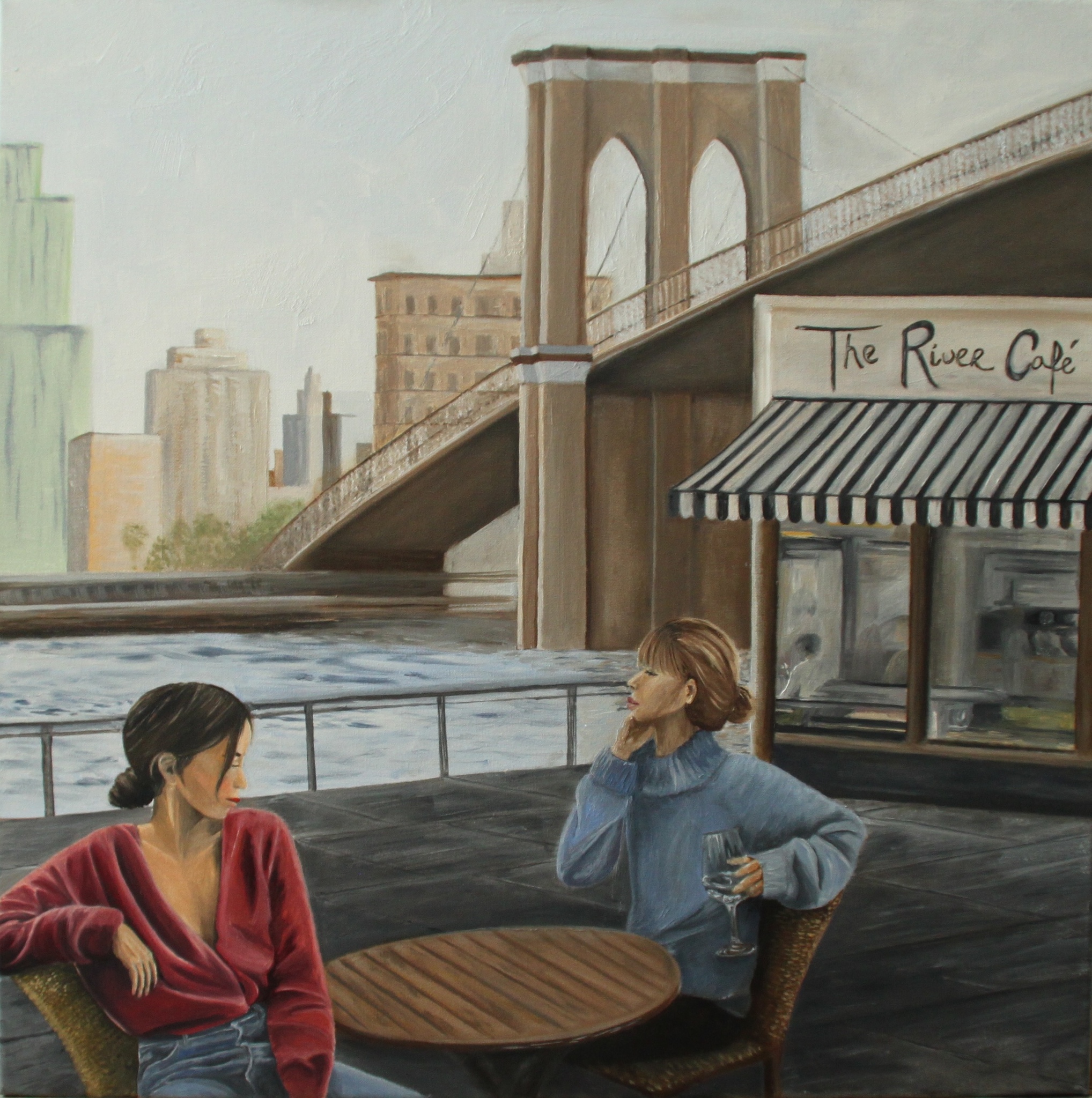 Woman Realistisch Olieverf Oilpainting Olieverfschilderij Friends Cafe Bridge Newyork Brooklyn Drinking Talking Realistischekunst Realisticart Brooklynbridge Rivercafe Womanatacafe
