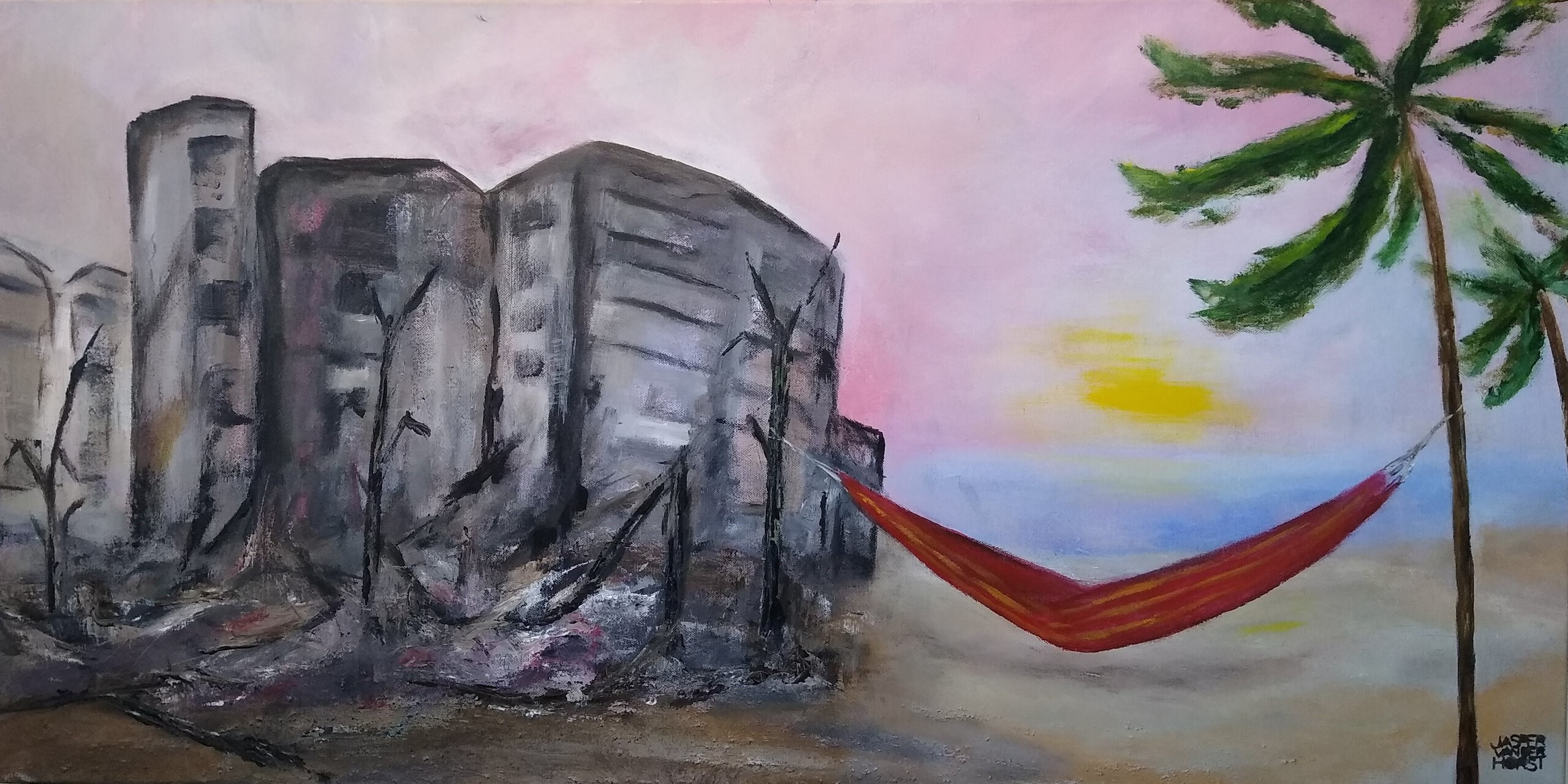 Een schilderij bij het oude verhaal van Jona en de puinhopen in deze tijd.