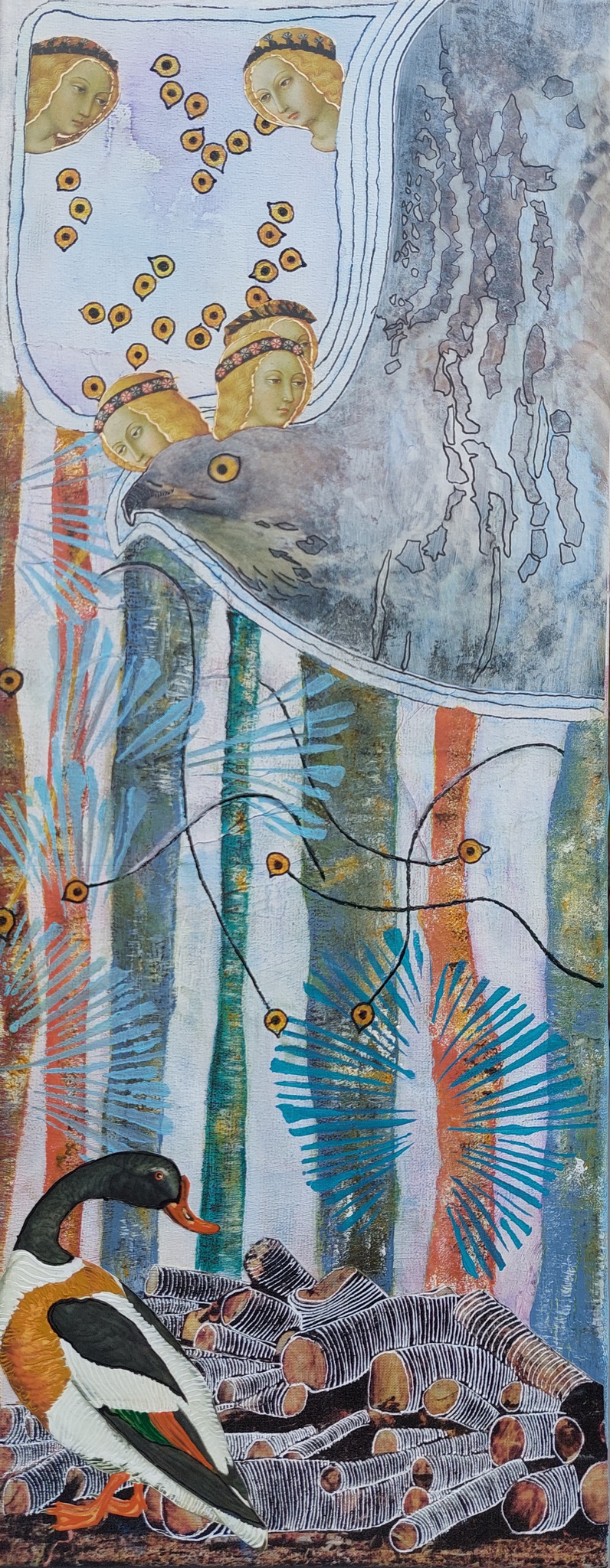 De duif ziet alles, gemengde techniek op canvas 50 x 20 cm
