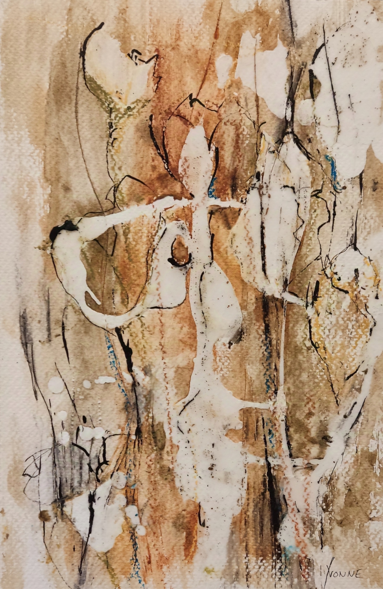 Wit Geel Bloemen Bruin Mixed Media Abstraherend