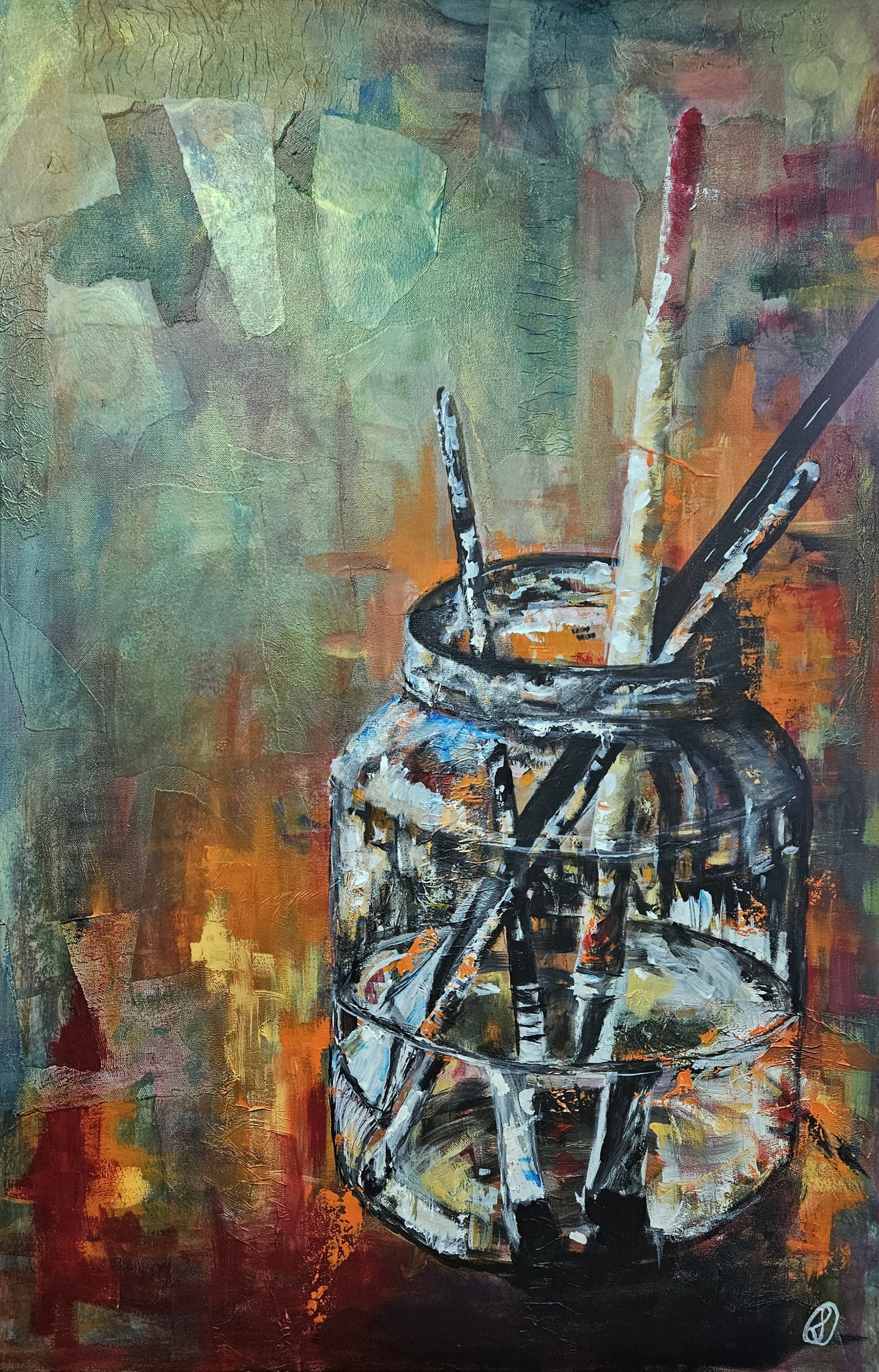 Stilleven van een pot met penselen. Collagetechniek, acrylverf op canvasdoek.