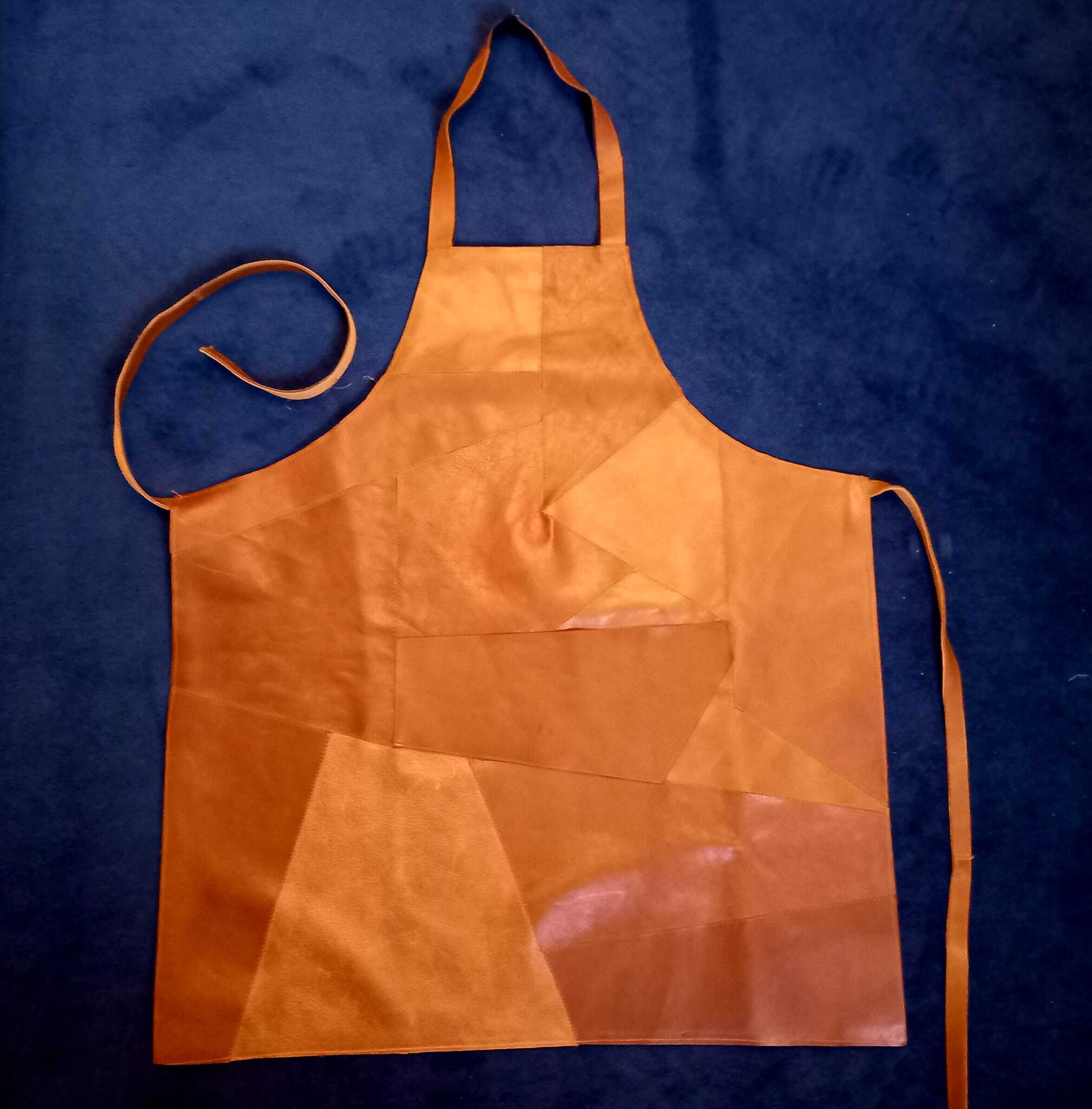 Via Marktplaats 2 dozen met leren meubelstalen gekocht. Eerst maar eens een schort gemaakt voor onze schoonzoon. Kon ik goed oefenen met grote stukken aan elkaar zetten. Bovendien kon ik zo goed ervaren hoe zoiets werkt. Je moet alles leren tenslotte.