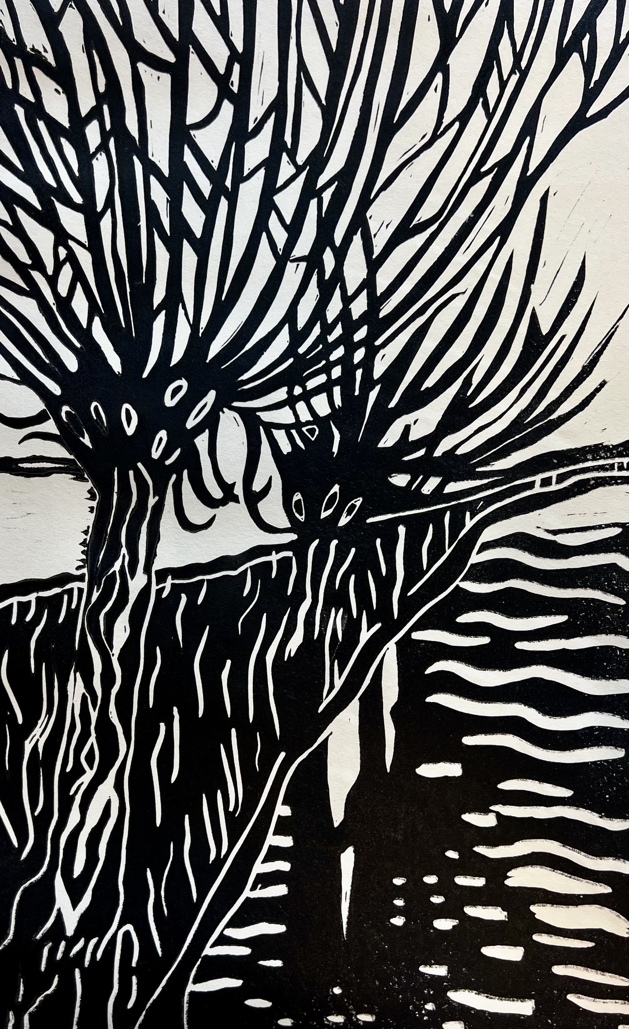 Linoleum cut of a row of willow trees, from an own photograhp made in March at the "onderweg" in Schoorl.
