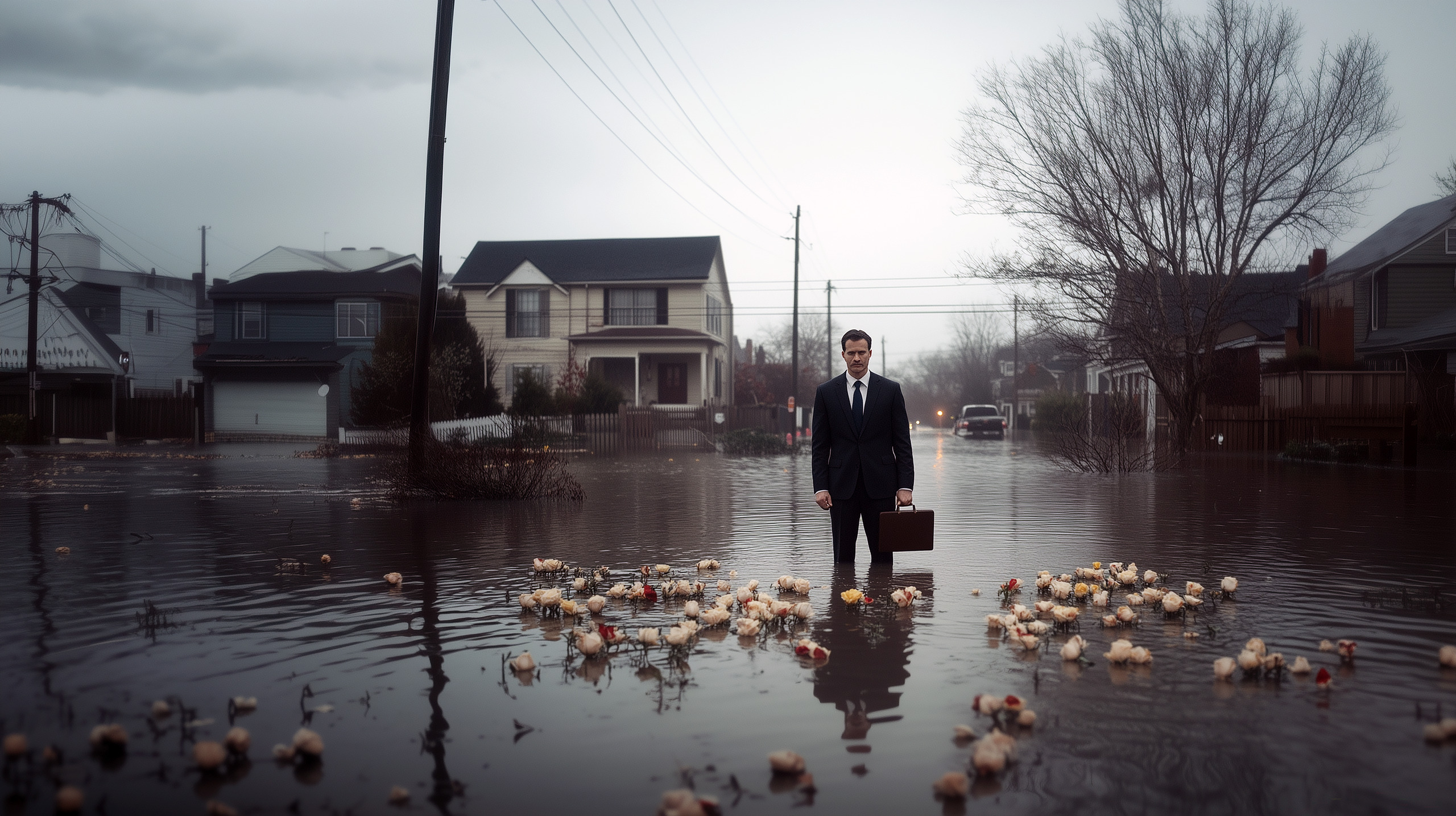 In the wake of a forgotten storm, the world had changed. The streets, once familiar and vibrant, now lay submerged in silence, the remnants of life scattered like broken promises. He walked alone, his polished shoes sinking into the floodwaters that stretched as far as the eye could see. In his hand, a briefcase—a relic of a world that no longer cared for business, deals, or progress. The flowers floating in the murky waters were both a memory and a warning, their petals wilting under the weight of an invisible force. No one had expected the end to arrive this way: not with a bang, but with a rising tide, swallowing the cities bit by bit. They called it climate change. But as he stood there, surrounded by the drowned hopes of a society that had once thrived, he knew it was more than that. It was the slow decay of everything they had built—the collapse of certainty, the fading of control. The world was sinking, and all he could do was watch.