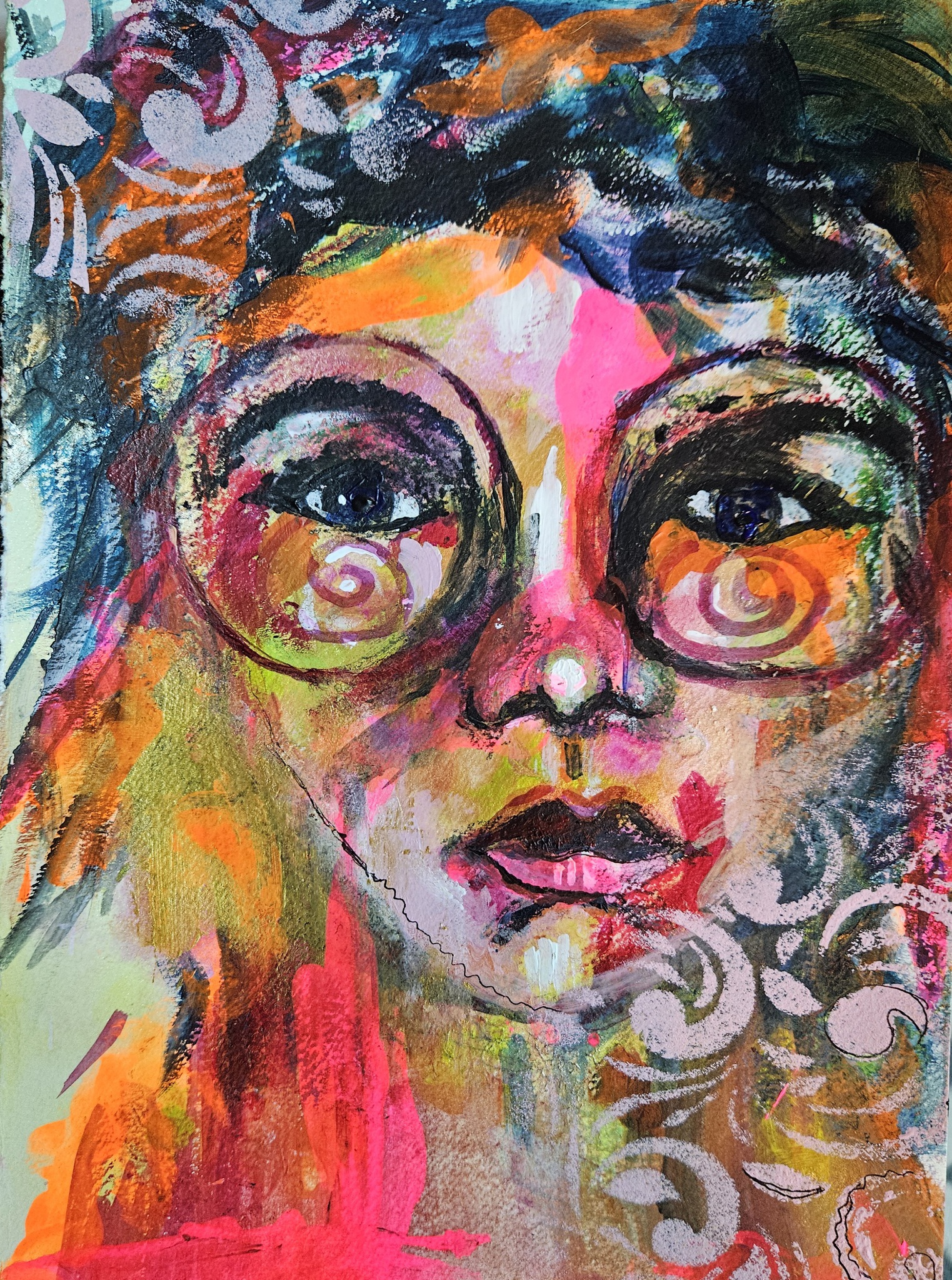 Ik begin met een basisidee en laat me verassen met wat komt. Graag gebruik ik verschillende materialen en veel kleur! Het resultaat is vaak een portret.
