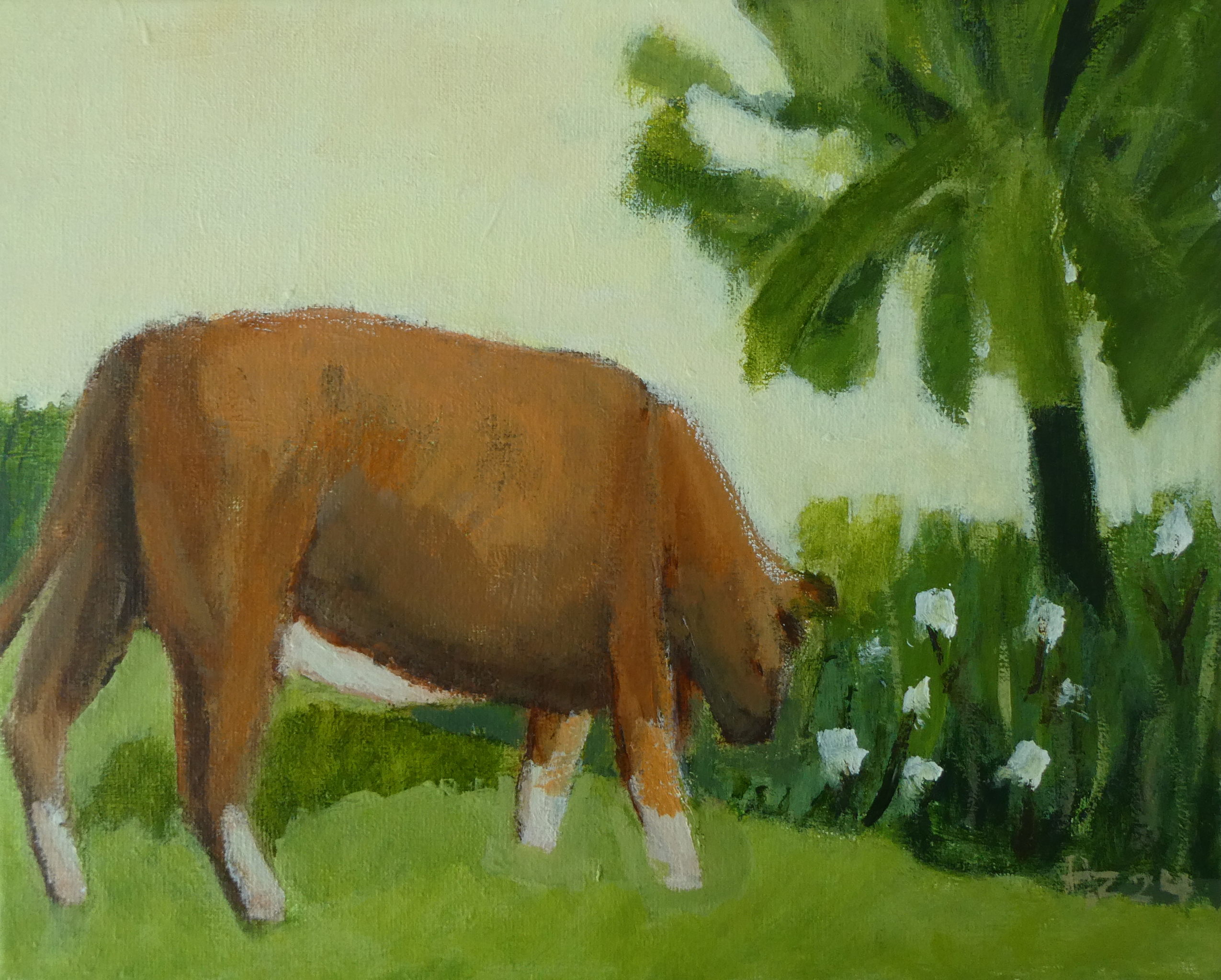 Koe in de wei in de zomer. Gemaakt en plein air in acryl op doek. Als ik ga zitten, komen koeien eerst kijken. Blijf ik rustig zitten dan gaan ze weer door met grazen, grazen, grazen. en verteren. 24 x 30 cm