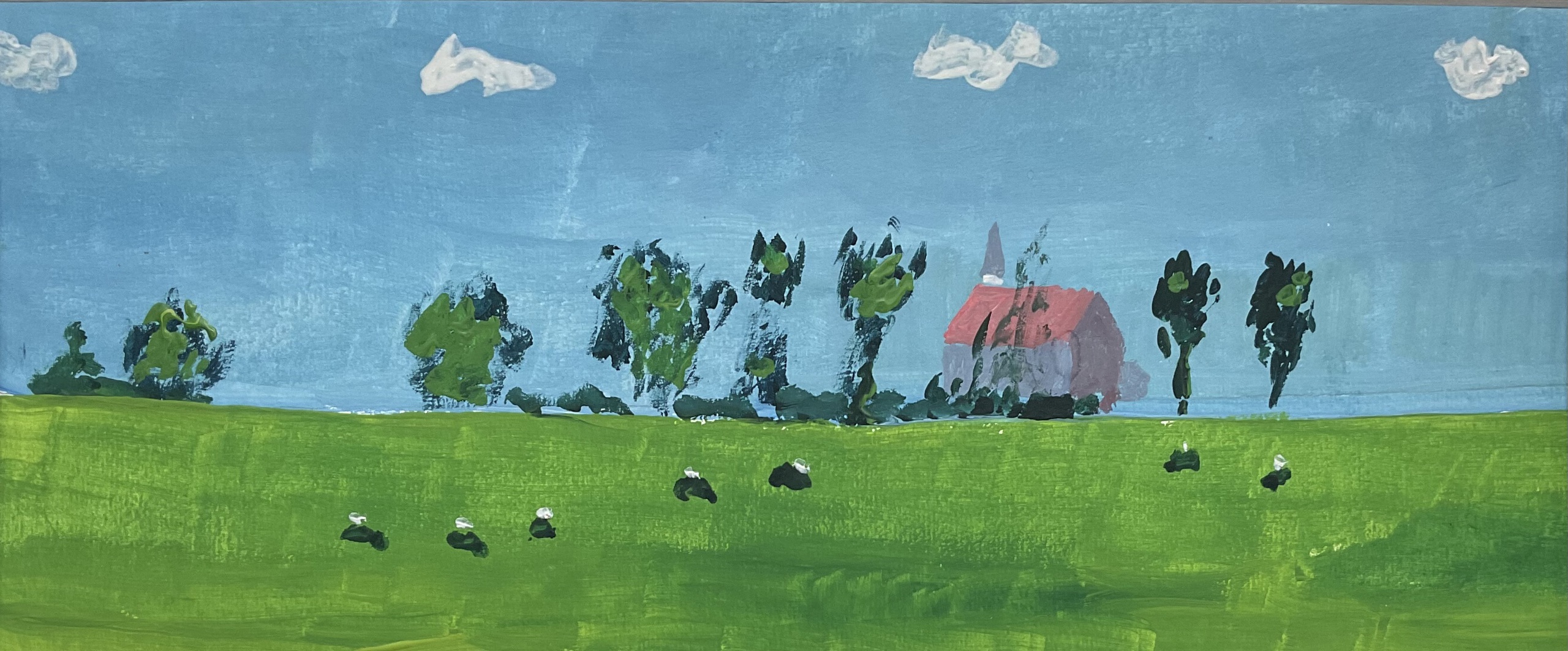 Wit Blauw Paars Wolken Groen Bomen Lucht Koeien Donkerblauw Kerkje Grasland Struiken Rosé