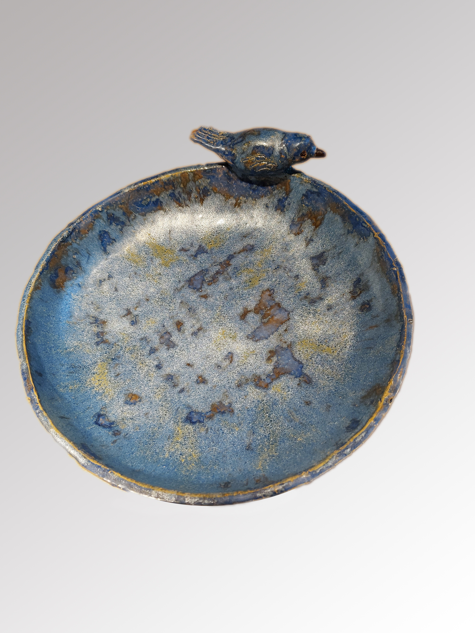 Vogelschaal met vogeltje, hoog gestookt op 1230 graden, vorstbestendig.